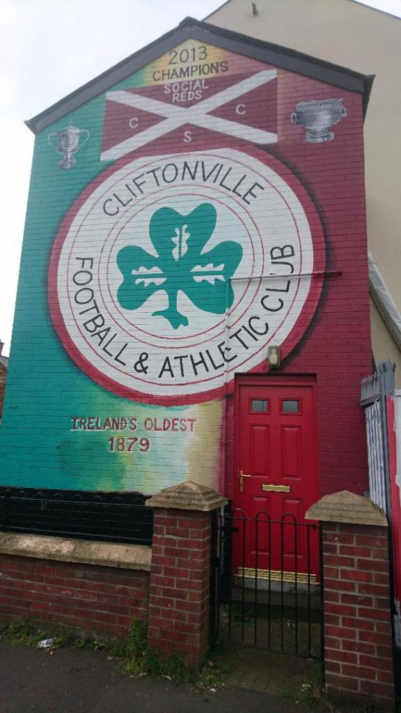 As I was over in a couple of months, I decided I was to ignore any sightseeing and just see the inside of bars and sample the delights of Irelands brewing capabilities. So much so was the plan I asked the taxi driver to drop me at a good pub near my hotel, to which he duly obliged. This after questioning me about whether I was decent or not. I.e I was scottish and who did I support to which my reply was “ I support Aberdeen so make what you want of that”. It was a good enough answer and I was dropped off in the famous Commercial Court area. Swiftly ticked off were the Dark Horse, The Duke of York, Harp Bar, the bar in my hotel where I had a swift one and some delightful salmon after dumping my bag. More importantly I did what any Dons fan should do I had a couple in The John Hewitt. Once my mini pub crawl was completed, I headed for Solitude as the club were trying to get fans of both sides up for a beer and burger (for a fiver) and basically for a pre-game party. As the weather was good, I thought the twenty-five minutes on foot quoted by google maps was doable and I couldn’t go wrong either as I have in the past at other grounds in other cities. Crumlin Road turn left on to Antrim Road and eventually left up Cliftonville Road. Easy. It was interesting seeing the sights or the murals to be precise. Once I arrived at the Cliftonville FC mural I had a feeling I was close. Looking down a side street to my right I saw a lot of red bricks. Bingo. I was in the social club early and it was dead. But it quickly filled up. The party plan was a success. The place was rammed, with three or four tables of the “Barry Boys” and the rest locals. There was live music and the sing offs between opposing fans generated a great atmosphere. It was in here I witnessed my first piece of local hospitality. When getting a pint, I was asked about my accent. Basically, it was not Welsh or Irish. Once I explained I had taken a day trip and an Aberdeen fan the barman told me to keep my money in my pocket. Free pint number one. Next time I headed to the bar a Barry Town fan was speaking to me in the queue and thought I was mad to travel for a Europa League pre qualifier. Free pint number two. I lost my seat eventually when away for a piss so ended up sitting on the pool table taking in the sing offs and a couple of Cliftonville fans got chatting to me. Again, I was seen to be a bit mad for my day trip. Free pint number three and four came my way. But the friendliness didn’t stop there as I was to find out once into Solitude. My first port of call when abroad is always the search for a scarf to add to my collection. Solitude almost put the first dent in my foreign scarf collection. I could have cried when the woman in the club shop told me as the season had not really started, they were still awaiting the delivery of new garb. I wanted to be sick. I explained that it was “bloody typical” that my milestone fiftieth game abroad was to end my run of scarf collecting. She could not have been more apologetic. Then as if by some miracle I was tapped on the shoulder as I exited the shop. A girl told me she heard my disappointing story and told me “now how could I let you leave our club empty handed” then handed me her scarf. I rebuffed the gesture as I know scarves can be sentimental, but she was insistent that I took it. I offered her money for it but no. She said she can always get another one and stated that “every time you see it, you can remember how great Cliftonville fans are”. Ill forever be indebted to that young lady. Going by the hospitality shown so far, she wasn’t far off the mark. Cliftonville was turning into a great choice of clubs to visit.