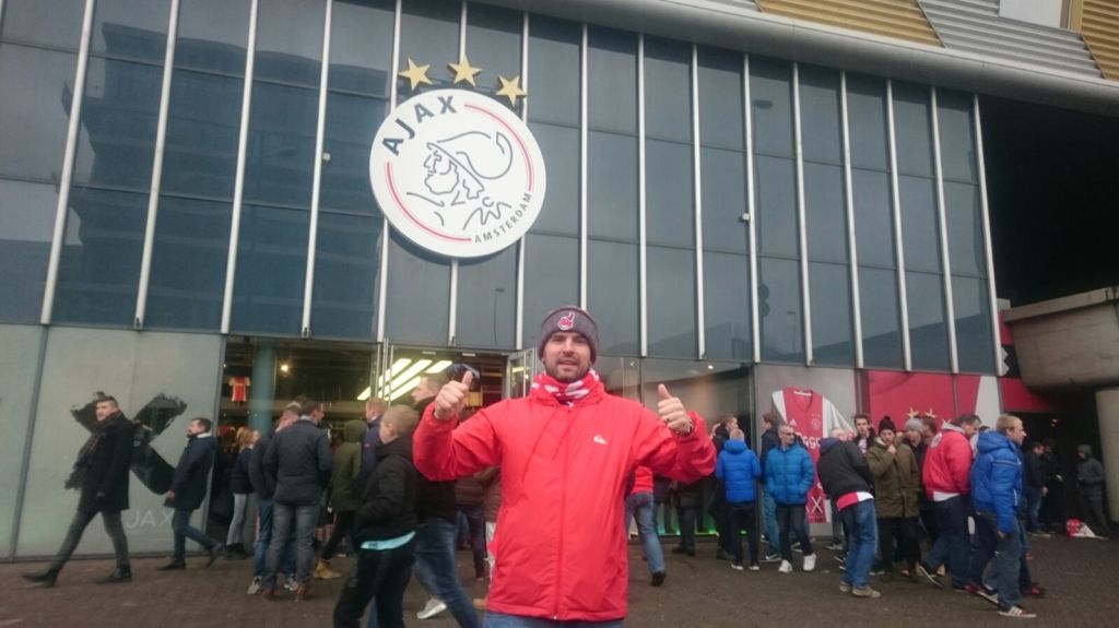4am check in at ABZ complete with a couple of Bodingtons, I was buzzing like a wee bairn. It not something that happens that often these days but I was fucking delighted to be heading over all truth told. After all the boring travel stuff I arrived at Centraal station where the weather was absolutely horrendous. Near gale force winds and biblical rain would be an understatement. I thought my next actions should be Taxi-Hotel-nearest boozer-work out transport to the ground. So I found myself in the world famous Three Sisters Pub at 10am drinking 8% Belgian beer without realising the shit canning potential until the waitress said “if you want to see the football I would change beers”. So after that sensible advice and switch of beers I managed to work out that the Metro was the best way to get to the Arena with this coming as a real disappointment after I was expecting it to be by Trojan horse. What a caker to get there though, a train every eight minutes, thirteen minutes to get there and two stops at the ground. Wiggy if you are looking in, better amend the plans and add a Metro line out to Kingsford. After alighting at the second stop, the child at Christmas excitement hit me again. The red and white scarves and flags were visible, there were thousands of fans kicking about, merch vendors everywhere and best of all the Arena looking like a spaceship had just plonked itself in amongst the endless bars and eateries that line the forecourt between the station and the stadium. After a fruitless search to find a programme, the search morphed into finding the emptiest looking pub. A Grolsh bar directly across from the player’s entrance was to be the place as people seemed to be avoiding it due to chunks of roof blowing off a nearby hotel. (I did say near gale force earlier). Once inside a couple of non-Dutch sounding guys asked if they could sit at my table. After one noticed my Dons polo shirt under my jacket they struck up a conversation. Turned out they were Bristol City fans on a weekend jaunt to get “something different”. It also was apparent pretty quickly they didn’t have many good words in regards to Derek McInnes. They did however say they were gutted Paul Hartley was thirty three when he signed as “he was a fucking player” and would have liked him there a few years prior. A few beers down and some fitba travelling stories swapped it was time to leave my new found Aquascutum clad “Brizzle” pals. After tackling the never ending mass off confusing staircases I found the gate for my seat which was conveniently situated next to a quickly visited bar, but more importantly I noticed the roof was closed, this meaning I was to watch my first ever indoor game, milestone.