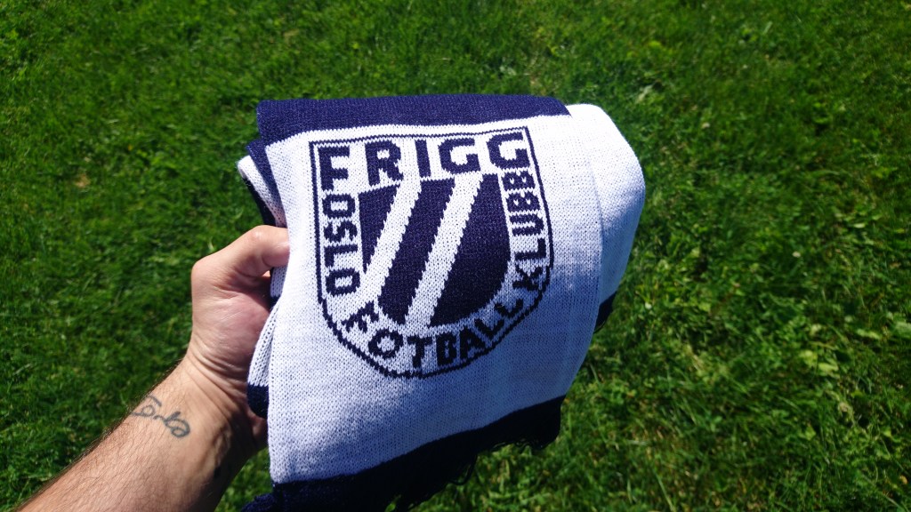 When I entered I was met by the same committee member from earlier and another two guys, I was made welcome and offered a cup of tea. I was told they had never known a Scotsman to deliberately take on a Frigg game before and could only remember an Irish guy turning up once upon a time. We talked Frigg, and how they lead a hand to mouth existence . I found out they are named after Frigg from Norse Mythology and nothing to do with “the good ship Venus”. I was also told that they had one venture into Europe into the old Fairs Cup only to be dumped out by a Scottish team. That was Dunfermline who put them out 6-2 on aggregate after two mirrored scoring games. They had qualified as runners up in the Norwegian cup. The Norwegian Cup being the only trophy they had won in their existence with three wins in a ten year period between the two wars. But hard times had fallen on them with relegation to the third division the previous season to my Torteburg visit. This may have explained why the Frogner Stadion was down as their ground on the net as they most likely used it in the second tier. After a good blether with the guys, I was handed the holy grail , a scarf and told “we heard about your collection”.Elated doesn’t cover it. I offered a donation to the club and I was told that all I needed to do was tell people back home that the people at Frigg were great people. Sounded like a more than fair deal to me.