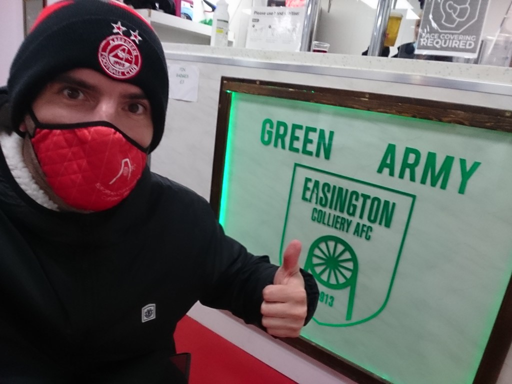After heading through the woods I stumbled upon the Welfare Ground. Here I was was given a good welcome from the lady and gentleman on the gate, who I couldn’t help but think thought I was a bit mad travel to watch so far to watch tenth tier English fitba. But as I explained, its any port in a storm for us Scots just now. I like the Welfare Ground, it has a charm to it, when you walk through the gate you are faced with a cracking sea view with the lights of Hartlepool in the distance and coincidentally Redcar in behind there. There also seemed to be a great vibe to the place. I was by no means the first there despite being extremely punctual myself but there were a good number there, beers flowing and laughs and chatter all around the bar area(outdoors as the clubhouse its self is closed due to Durham FA regulations). It got me thinking that people live for their fitba, fitba teams like Easington Colliery are part of the community and how this set up is not allowed in Scotland is not a complete joke.(105 people were in attendance, I am sure there were more in Tesco when was there on Wednesday). All rules were adhered to, there was distancing, masks, hand gel usage and we were all outside for god sake. It also raises the question on our prohibition drinking rules in our own lower game. A bugbear of mine if ever there was one.