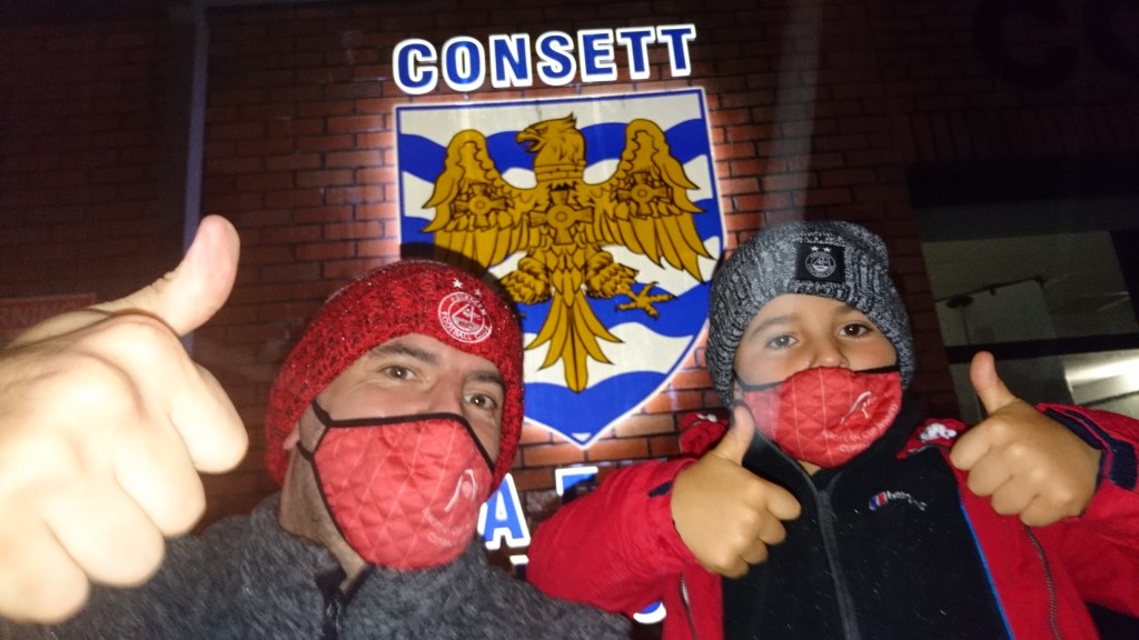 County Durham again, I need to look into a holiday home as its fastly becoming my second home. Three of four so far have been down there and I have had a call off too. I didnt plan to be there tonight, I was actually supposed to be at Morpeth v Warrington which was called off due to corona. Then I opted for Hebburn Town v Stockton Town as they are on my list and it was a top of the table clash. The rain put that match to the sword. But with a hotel booked and a son desperate for fitba I decided to carry on travelling despite knowing the game was off. The thought was “I really hope Durham v Easington Colliery or Sunderland Ryhope v West Auckland are on”. Then some unknown to me conversations on Twitter were afoot and after dialogue with Consett we were invited there to take up returned tickets(they had met corona capacity). Being only thirty mins away I couldn’t help think the fitba gods were on my side on this one. Which turned out to be entirely correct.