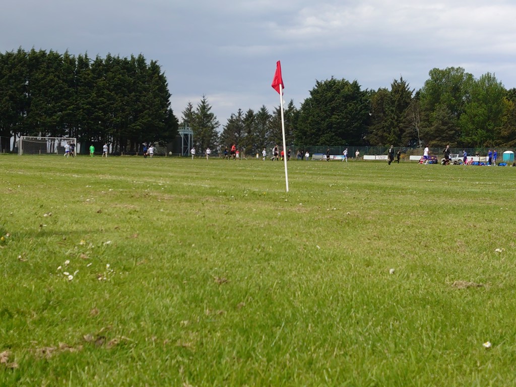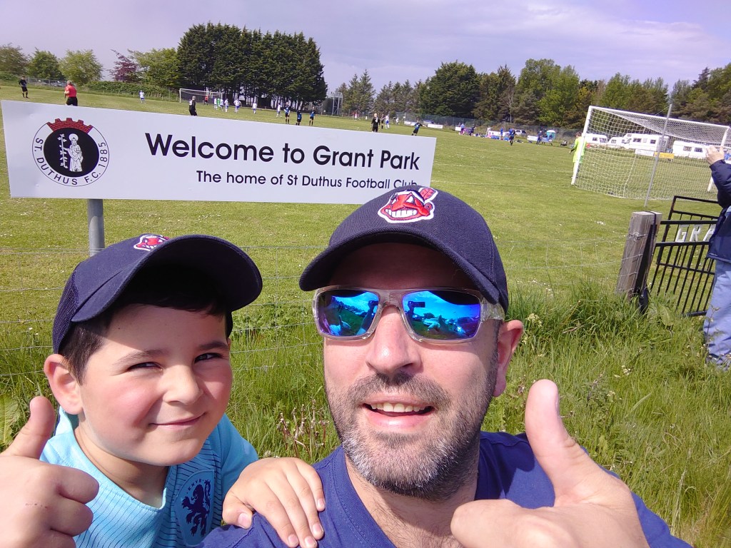 Today’s derby(is this classed as derby with eleven miles between them?) turned out to be a good match to watch. Open, chances, some great performances and a picnic at Wee Mans request. We arrived at Grant Park bang on kick off to a decent sized crowd and what looked to be a travellers site(which I am surprised was not on the actual pitch in the usual style). Both teams looked up for it from the off and there was not much between them in the first half. The hosts put the ball up the park a lot and had decent spells of possession but didn’t really create much. Invergordon had an equal share of possession but did create with no finishing touch to be added. The first of note was a mazy run from the visiting 11 who’s feet looked to be a blur as he skipped past three Saints players but keeper Allan was equal to it with a solid save with his foot. The effort could have been harder but a decent save none the less. Almost immediately Invergordon were again guilty of poor finishing when after being set up perfectly the 11 again fluffed his lines and ballooned his effort over the bar and the car park with what looked to be a rush of blood. The Saints keeper was the busier of the two and was called into action a couple of times with very tidy saves before the half was out to keep his clean sheet in tact. Towards the end of the first period I realised the Invergordon number 20 was in a different shirt from the rest of his team mates team for whatever reason. I find this to be gloriously non-league. The last action of the half came when there was a tussle at the edge of the Saints box right in front of us where the home man As-Chainey was struck in the face bursting his nose in the process. To me I would say it was malicious. The linesman on the other hand said no and to make matters even worse , it was given as an Invergordon freekick.