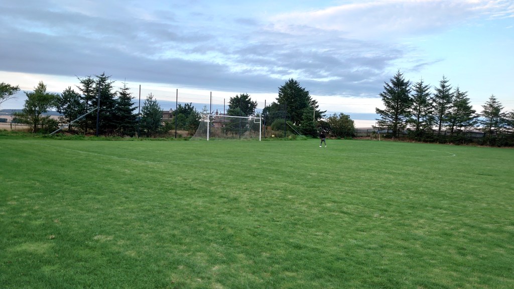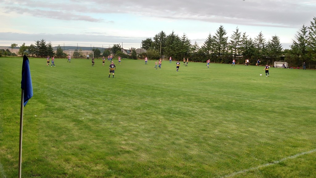 The Halfway House is another of these grounds that I have played in the past but not watched a game at. This is surprising as being an Ellon native and its proximity to Ardallie. The Halfway House also more than fits in to the qualification in my ground rules so a Monday night in the warm Aberdeenshire heat was more than welcome. Ever since I first set foot here many years ago I have though its a quality ground and has scope to be even better. You could make it an ace Junior ground for example. It’s fenced in already,there is room for a clubhouse to be built on the new changing room(The place has had a bit of a face lift in recent years). It would be cozy due to the proximity to the adjacent A952 Ellon to Fraserburgh Road but I think it would be possible with a bit of tinkering. But I am just rambling. A final point on it, Ellon United play five miles away at the Meadows that is A-extortionate to play on, B-easy to sneak a watch without paying and C-a bit shite to be honest. Anyway the fitba…..