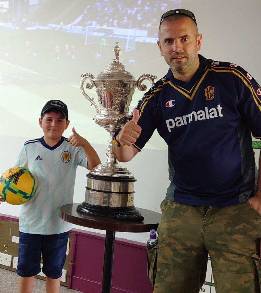 Due to the sweltering heat we headed into the huge social club for some respite from the elements. It was in here I realised the fitba gods were well on our side. Sitting on the stage was the Scottish Junior Cup. I have a decent history with this particular trophy. Played in it a few times but more recently I challenged myself to head to every club to win it in my life. Corona scuppered the plan which I would bet my house I would have completed by now if it was not for the pandemic. Arthurlie, Glenafton Athletic and Renfrew are outstanding from my 37 years on the planet(18 teams have won it in total). My inner fitba geek was well on show and the obligatory thumbs up photo was taken. The closest I had been to it in the past was when I saw it in Auchinleck Talbot’s trophy cabinet. Half time also gave me a first. I have never seen ice poles sold at the fitba before. Not that it affects me but Wee Man was delighted with this news and got wired in.