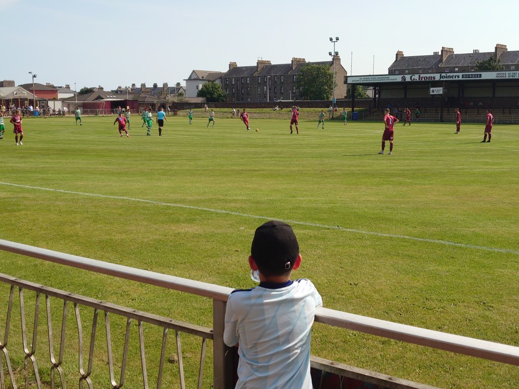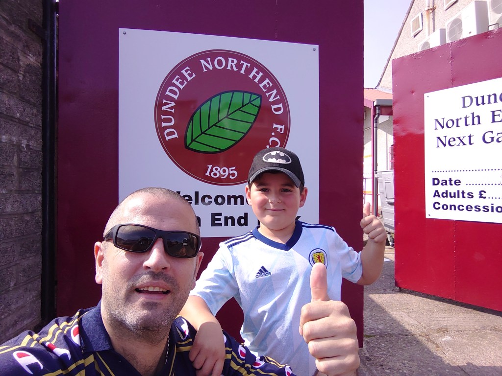 Sometimes things just don’t go to plan. Today was one of those days. However, sometimes when things don’t go to plan they turn out bloody awesome and that’s pretty much how Wee Man and me thought our trip day went. As we were away to leave for Brechin Victoria v Blairgowrie I found out the game was off. Fortunate as I only checked to make sure the kick off was half two. Lucky this was the case. This left us one and a half hours to get to Dundee. For a first visit to North End Park. Could we make it? With the two sets of roadworks on the A90 to contend with plus our Meldrum abode being approximately one and a half hours from Dundee North End’s ground it was going to be tight. Also to be factored in was Dundee United were hosting Hearts just the other side of Cleppington Road I may have faced parking issues. Surely nothing else could go wrong with my third choice of game. Yes third. Brechin Vics was plan B. Plan A was actually being dangerously close to Ibrox at Benburb v Cumnock. This was ruled out due to Wee Man being busy in the morning leaving too little time to get to Glasgow.(As it happened this was also postponed anyway). I need not have worried as the football gods were looking upon us. As we approached the North End’s home a bus full of Tannadice bound supporters pulled away leaving a space about twenty yards from the gate which we entered with ten minutes to spare.