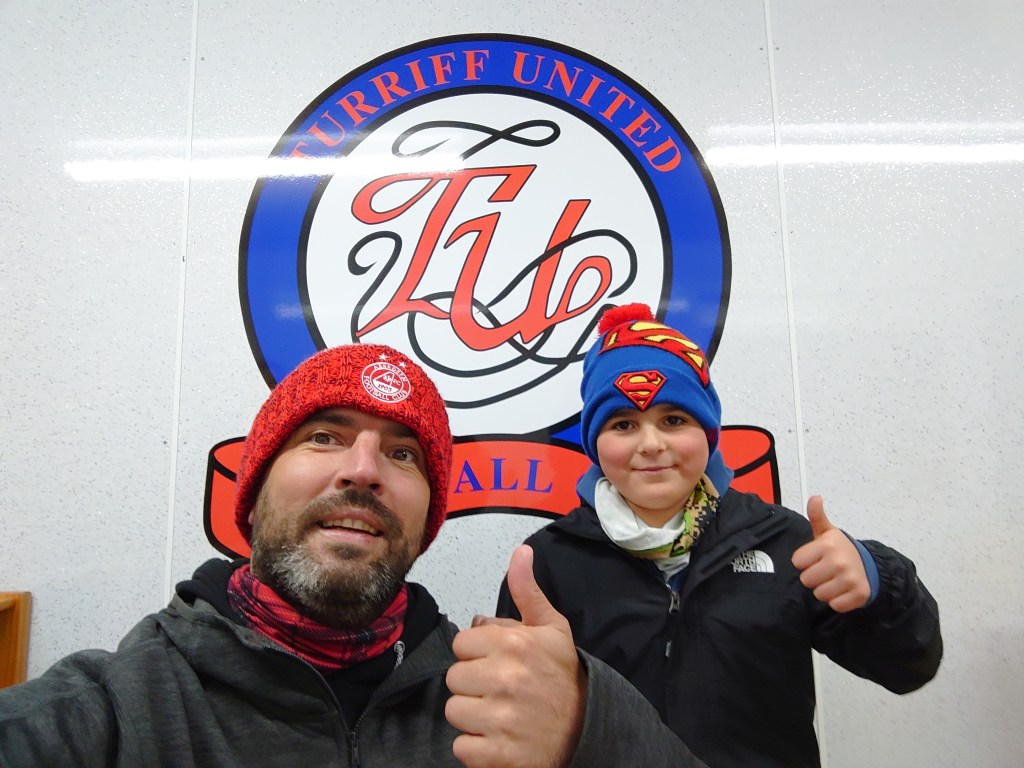 On arrival at the gate we were given a fine welcome from the lovely lady on the cash duties. As we were getting the thumbs up photo (at the gate) it got conversation going with her and a couple of committee guys. They loved the story of Wee Man’s travels and could not believe a 7 year old could have been to 82 grounds. It is quite impressive to be fair. It was a great welcome to a club I have always enjoyed visiting and I suppose I could say have a wee soft spot for. A regular haunt for me given its proximity to Oldmeldrum which makes the fact this was Wee Man’s first visit a bit of a surprise. With a wee bit of time to burn a pint and juice was had in the fan bar. It was in here speaking to another committee member, I mentioned i thought it was a shame Brechin were up on a midweeker as a Saturday would see many more fans in attendance. He told me this game was pulled forward and the original date was heavily booked up by Brechin fans. The moving of the game is a shame on two counts due to a big loss of cash for Turriff but also interested Brechin fans miss out on the great ground the the Haughs is and may not get back if the holy grail of an immediate return to league fitba is achieved.