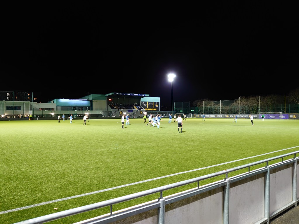 With the recent storms still playing havoc with fitba plans, Wee Man and I were on to game two of this trip home. As a first together it was to the same ground as our previous adventure. This due to a trip to Dalkeith tonight being ground damaged off (bloody storms). Tonight was also to put Spain Park out in front of Wee Man’s most frequented on four (Pittodrie and Harlaw Park both on three). Also to be noted, over the last three years we have watched Banks o’ Dee more than any team anywhere by a long way. I cant be far away from finding myself shouting “mon e Dee”.
