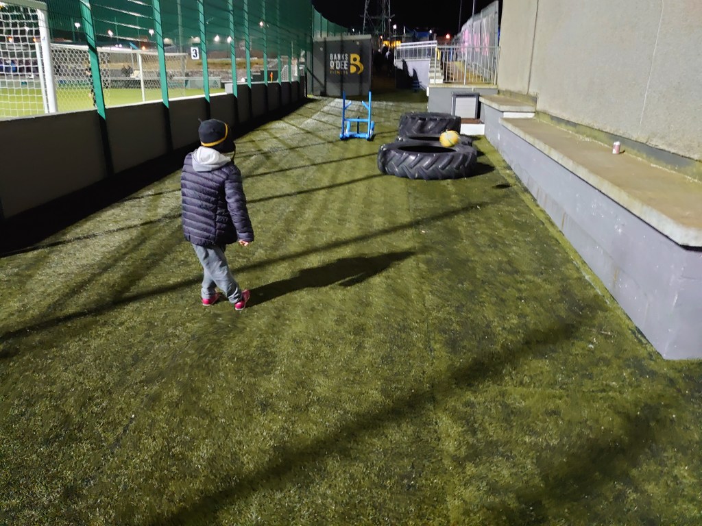 The break saw Wee Man develop a wee game where we had to chip his yellow ball into tractor tyres behind the goal. Laid out in a straight line, it was one point in the first one, two in the second and so on. I lost 5 v 1 to a seven year old. Good fun though.