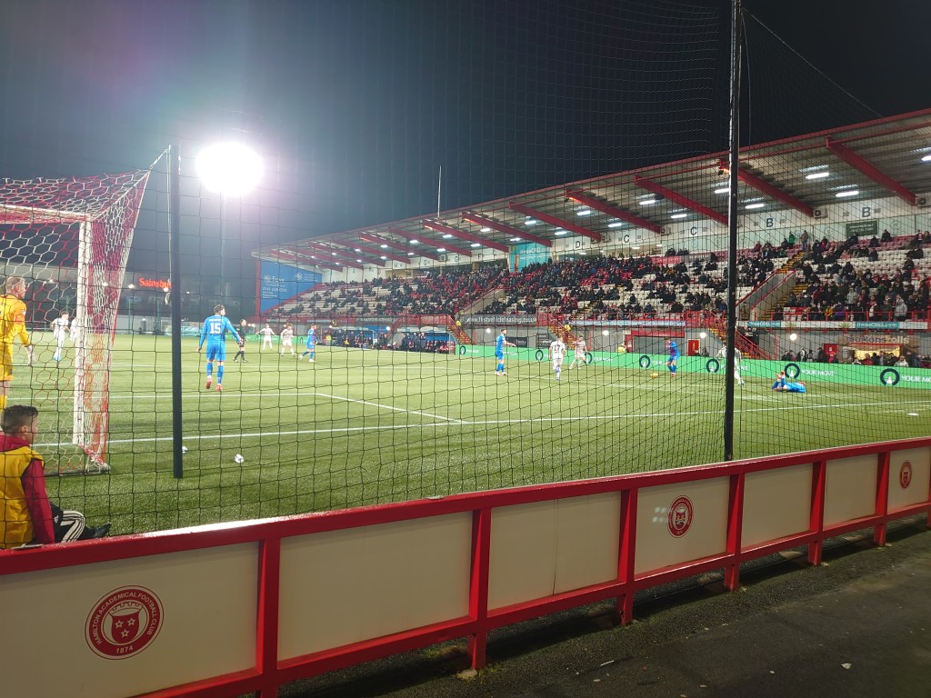 After missing out on a floodlight Friday last week due to being snowed in we were back on our travels, this time to South Lanarkshire to Hamilton to the longest named fixture in the SPFL. Straight from the school run we made bloody good time down the road and parked up at Sainbury’s, this to allow me to stock up my new favourite beer, Cranborne Poacher(Badger) which I only seem to find in Sainbury’s and there is not one near me. Any excuse. With a clearly excited Wee Man as we walked toward the lights of the ground he strangely asked if we could sit in the away end. A quick check of Accies twitter outside the gate and there was a link for Caley fans. Easy done as the Accies use Fanbase which I have used in the past for games so I had an account. Two minutes later we were in the sparsely populated Invernesian end. Incidentally the only other time we have sat in the away end on our travels out with Aberdeen was when I took him to Tannadice where the Arabs were up against…….Caley. Did this play a part in his decision? One decision that was definite was my choice of visiting New Douglas Park was to take me down to one left of the forty two SPFL grounds still to visit as for some reason NDP has seemed to elude me when in the Premier. I can’t put a reason to not watching the Dons there but, I do know we had many a midweek game there which wouldn’t have helped.