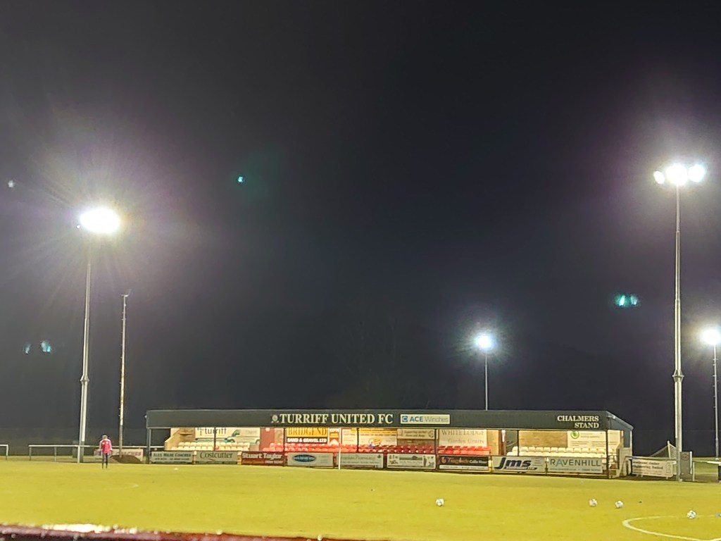 A local one under the lights for us as we had a wee matter to take care of at half ten at night. Where better than the ace set up that is The Haughs in Turriff, just a mere fifteen miles up the A947. The greatest league in the world on a Friday under the lights. Sign me up. A beer in the supporters bar prior to kick off saw us bump into an old fitba/college acquaintance who was on the corporate for the night. This leading to a catch up and making me aware of a potential team he coaches for Wee Man to join as he is now seeming to be keen on joining one. A good bonus for the night seeing Stuart after a good few years.