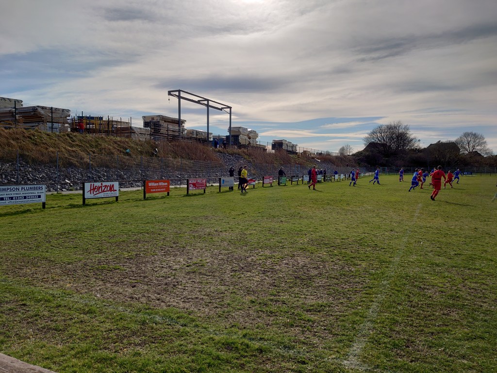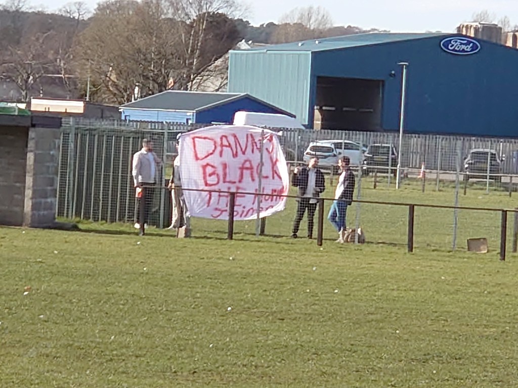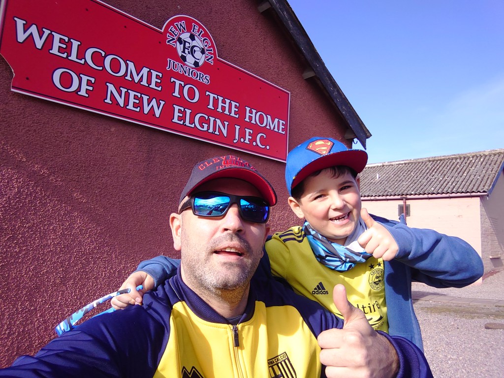 Nicol-Tognelli Park is nothing special. It is a fenced in pitch with bricked dug outs which appear to be new. There were a lot of unused bricks kicking about which we used as a perch. Left over from the dug out or is some plans afoot? With a quest of ticking off all the North Junior grounds it needed a visit despite its basic structure. (Nairn St Ninian the only outstanding venue now). The pitch has seen better days and was looking a sorry state and very threadbare but it was flat and didn’t effect the game. The game though was not a classic. It started with a bang when Forres talisman Matty Davidson cooly slotted home past the the New Elgin keeper when played through in the first minute. The pre-games prediction of a 6-0 Jags win looked to be on. But it didn’t materialize. The game had many a lull in activity. The visitors had a lot of the ball but didn’t do much with it and in fairness to the struggling hosts their defending limited the chances. Brandon should have doubled the lead when a great ball in from the left but he seemed to misstime getting on the end of it making the keepers job easy. The second did come and it was a cracking team goal with multiple passes leading to a good finish from Charlie Beck. That was about it for the action in this dull half of football. Dull it may have been but that didn’t ruin the mood of the travelling band of merry Thistle fans, complete with flag stating player “Danny Black is a horny joiner”. The only chance of the half for New Elgin came right on the half when their full back had a snap shot effort which went millimetres wide.