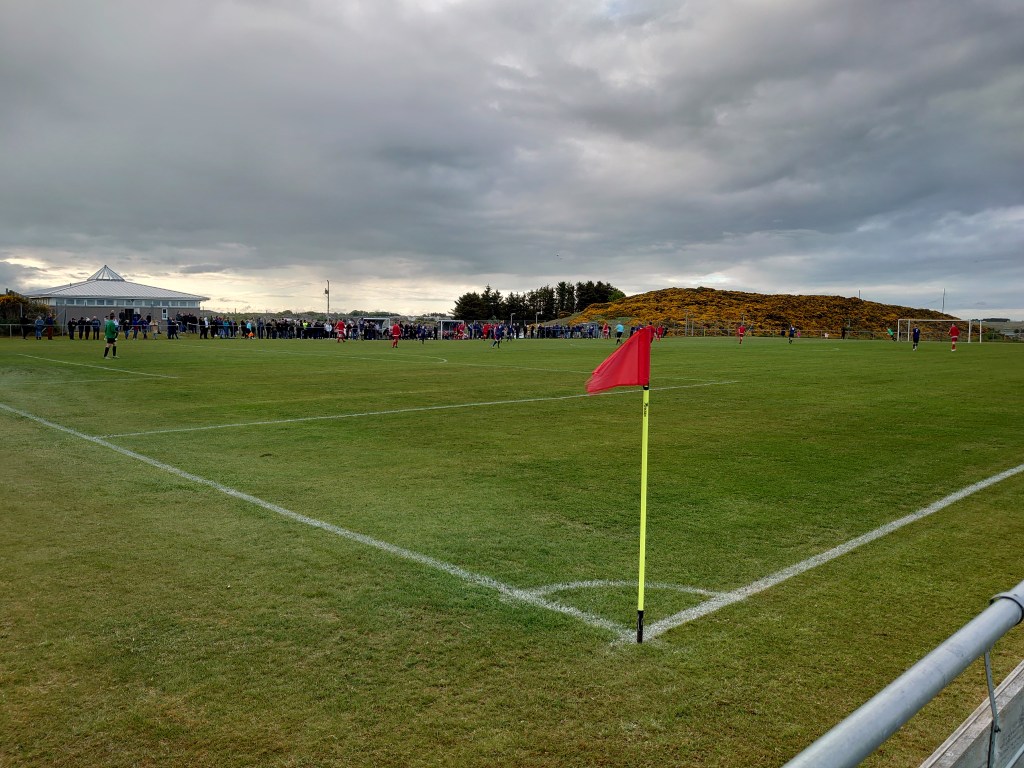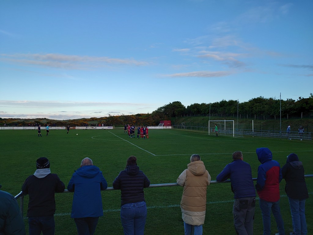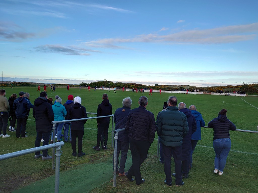 After a pint in Briggies (again memories came flooding back) I joined the healthy crowd at Gallowshill. This is a ground that holds a distinction over any other, yes there are many I have played on and watched a game at and this is no different, but here I have got drunk on numerous occasions and had drunken kick abouts. It is a tidy set up and in the higher end of amateur grounds and is Junior worthy (which it was once upon a time when Wilso……Hillhe…….Bridge of D…..Newburgh Thistle plied their trade there). I am a fan of the place for a few reasons. There are two drinking establishments in spitting distance being one. It’s handy being another. But most of all its set in really bonnie surrounds. You have the beach and the dunes, at this time of year the brush covered hills and depending where you stand you can see right up the coast towards Peterhead with the power station lum in view on a clear day. Then on top of that its constantly being serenaded by the tweets of the local avian population. Basic it may be structure wise but its a quality place to watch a game (when the North Sea elements are behaving themselves). Also it has an ace name.