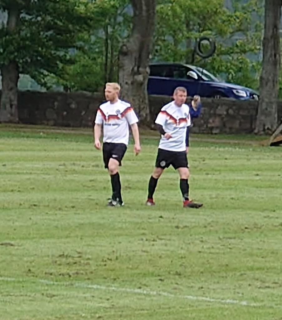 A wee set of goals next to the pitch was a guarantee of a kick about at half time and a simple game of me pinging shots at Wee Man was the order of the evening. But with half time being short it left him a little perturbed at the lack of time to hone his goalkeeping skills. The second half started with a terrible decision from the referee when Kincorth number 9 Gunn was through on goal but called offside. I was in line and I can assure you he was onside when the ball was played and the decision was an absolute coin toss. Not long after I was accosted by a dog who took a shine to me for some reason and a bloody big one at that . A friendly big beast of a thing that when asked what breed I was told a Romanian Mioritic Shepherd Dog. A dog breed that kills Wolves. Not that this one would as she was a big sook. A funny moment and one you don’t get at the upper levels of fitba. Back to the game and the first booking was handed out to Kincorth’s Murray. This on the fifty fifth minute but it wasn’t to be the last. Kincorth pushed for the opener and were astounded that the deadlock wasn’t broken after an hour when a cross made its way through a raft of bodies and goal bound. The destination was Mitchell’s bottom left hand corner but somehow the big keeper got down to flick it past the post. There were definite Gordon Banks vibes to it. The ball seemed to be behind him before he got down. Top goalkeeping. Then the opener came when wide man Andrew Ewen swung in a pin point accurate ball which found its way through the narrowest of channels deceiving the Echt back line and keeper picking out Urqhuart who headed into an unguarded net. The diminutive winger celebrated with a double somersault to match the quality of the cross that found him. A better ball I wont see for the rest of this season. I was right in line with Ewen as he struck it. A thing of beauty. Kincorth were by far the better team at this point and created enough chances to bury the game but could not get the deal done. They then had Clarke in goal to thank for keeping them in the lead when he was wrong footed by a moving/deflected long range effort but miraculously managed to get a last gasp hand to it. A fine save from a man who is actually a centre midfielder. The visitors finally got the second through McKenzie who was left with a tap in after a bit a shambles when Mitchell pulled of what could be called an unorthodox save which went behind him. His teammate stopped the ball dead a couple of yards out leaving McKenzie to poke home into an open goal. Avoidable for Echt giving them a mountain to climb. That mountain was half scaled not long after when Aiden Greig blasted home but was it too late and would the old heads of Kincorth use their experience to hold out for their semi berth? No would be the answer. Echt counter attacked with Ewen in hot pursuit, the Kincorth man went flying in from behind taking the Echt man out the game. No sooner had Ewen got to his feet he had the second yellow and the subsequent red in his face. The resulting free kick was swung into the box with Anderson on hand to head home. A late come back for Echt, one I did not see coming. The home side again had their keeper Mitchell who made a another cracking save in the last minute to stop a Dean Stewart header taking the game to penalties. But not before a big bout of handbags broke out at the final whistle .