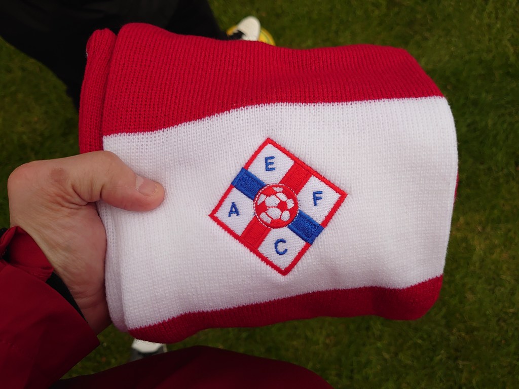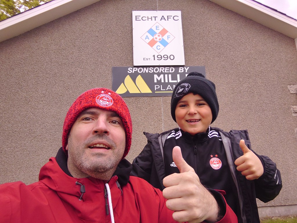 On arrival at Pleasure Park were getting the obligatory thumbs up photo when Echt manager Marc Reid spotted us. After asking for help with details on twitter he knew we were coming to watch. He went out his way and made Wee Man’s day by gifting him a hat, scarf and Haribos. A truly awesome gesture from the club, uncalled for but very welcome. It’s these details that junior remembers forever so he will definitely have grown a soft spot for Echt tonight in whats was a historic game for him as it was his first penalty shoot out in his brief fitba watching career. Which left him buzzing in the car on the way home.