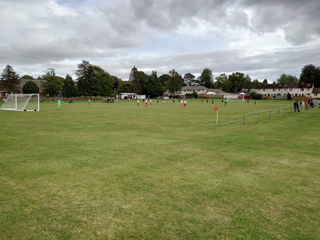 Being where we were and our almost completion of the Midland League it would have been rude not to have took in local side Scone Thistle’s match v Lochee Harp. After a very fine feed at Brown & Blacks, a local restaurant about two minutes from the ground we found ourselves with an hour and a half to burn until kick off. Only one thing to do at a time like that, kick about. So we headed to Farquharson Park and low and behold there was a disused set of goals. Cue the kick about to end all kick abouts. Thousands of shots at Wee Man ensued and a few hundred at me in amongst all the blackcurrants (bushes behind the goal) which clarted the ball, my hands, Wee Man’s shorts and legs. The blood like juice got bloody everywhere and probably ruined a fine pair of my Sambas. During this kick about Harp assistant manager Chris MacPherson appeared and recognized us. This leading to a blether about his side and fortunes for the coming season after what was a struggle last season. It’s a project to be sure. A tough one and I have to credit him and manager Alan McSkimming for taking it on. I also have to credit the big man for supplying me the teams for the night. Chris was the first of many affable folk to blether on the night. As we had been in the place for so long I had avoided paying, so when I went to pay once the gate was set up I was met with what seemed to be gratitude for my honesty. Even though it was only three quid I’m never going to try and steal a night at the fitba. This and I have an addiction to half time draws. Other committee members were spoken to and it seems like Scone have a decent bunch at the club. These people are invaluable to clubs. Especially struggling clubs which Scone have been of late like their visitors.