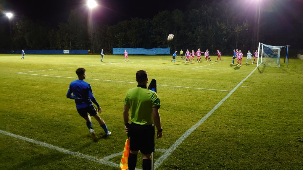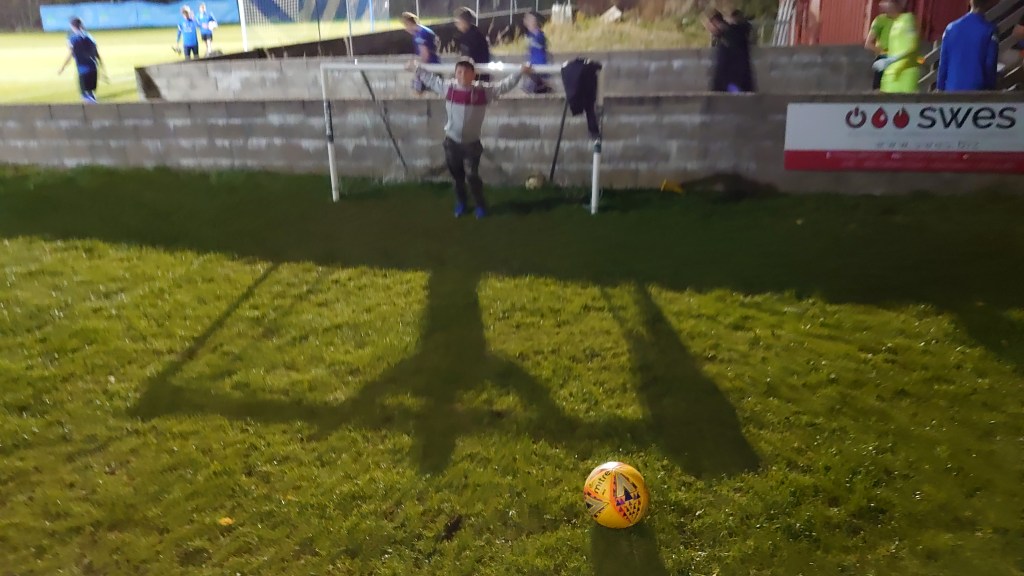 After another brilliant steak pie (the second in a week) the game kicked off under the Lochside lights. Formartine were the better team in the opening stages. But were up against a man on a mission to keep them out, Hermes keeper Greg Simpson. He was first called into action in the first minute when he pulled off a superb point blank save from a Jonathon Smith header. He told a punter on the sideline he “didnt know much about it” but i think he was doing himself an injustice. Great instincts were shown to get the ball away. Formartine looked hungry and were constantly in Hermes face and looked the more threatening going forward with Dominican international Julien Wade particularly looking dangerous, and putting himself about. Cole Anderson should have put United ahead when he was found in space inside the area but he sliced the ball wide. Good to see his dad, Aberdeen legend Russell Anderson in attendance too. Hermes found their feet a bit more and got into the game after around 25 minutes, this led to Formartines energetic start dying off and the match evening up. Hermes were well in it and but did not create much, but Formartine were not much better but they had the chance to go into the break in the lead but Anderson fluffed his lines late on. After defender Mitchell slipped (moulders instead of studs?), Anderson was clean through and but he inexplicably took an extra touch, then another then squandered the chance letting Simpson to pull off another solid save, but he should never have had the chance to save.