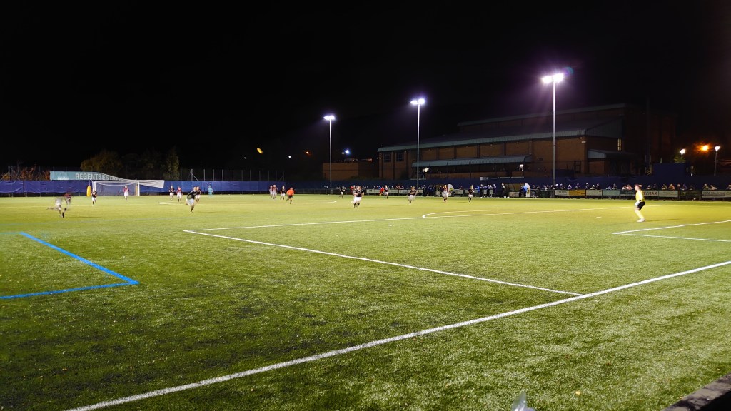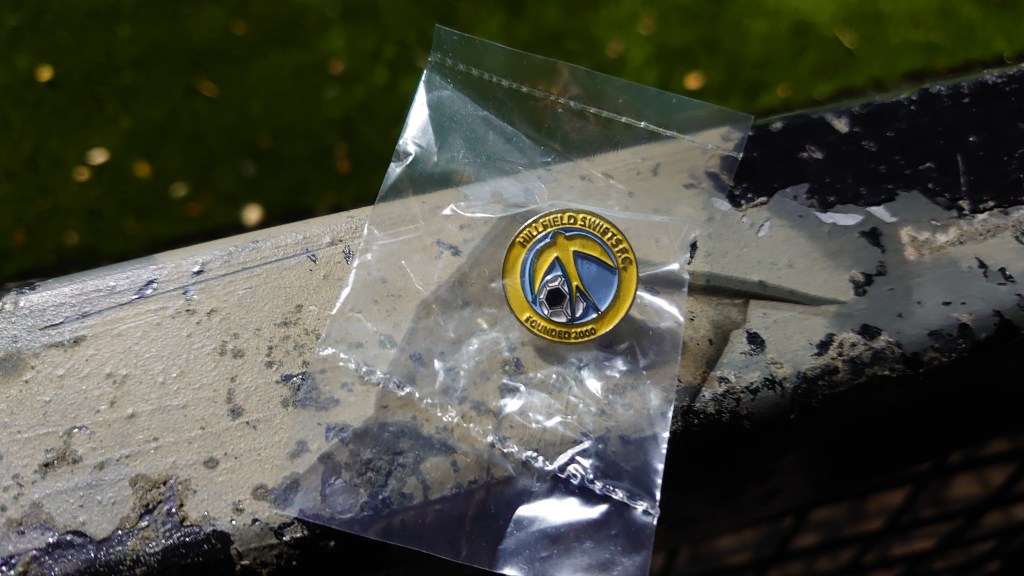 We still had a bit of time to burn prior to kick off and were even too early to head in for a kick about so wee had a wee blast of Mario Kart in the car where I noticed that even in the darkness it was still 14 degrees C. This meaning we were both well over dressed for the occasion. Finally we entered the ground and I was chuffed to see a pin badge with entry only boosted the price up a pound. That’s a bloody bargain. A pin badge for a pound is a steal but I will still be looking for a pint from my brother as payment (come to think of it I am still due hundreds of pints from over the years if you are reading min).