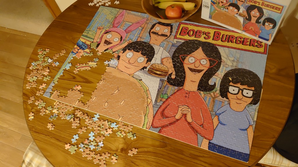 I had ideas of spending the day in Aberdeen prior to the game but nobody was keen. So after asking Wee Man what he wanted to do instead, his simply wanted to do his Bob’s Burgers jigsaw. He really is a kid of simple pleasures. The jigsaw was we did for pre match entertainment and bangers and mash was the tea and you know what…….. It was an ace afternoon the two of us, well three as the puss kept jumping up and lying on the bloody puzzle.