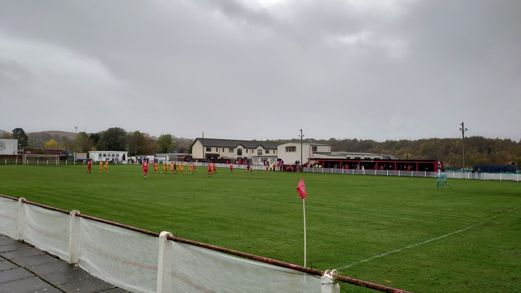 Once at the fitba we were greeted with a driech afternoon with the drizzle not letting off. The pitch was cutting up under the warm up which was a good sign to me. You canna beat a quagmire. We grabbed a pie and a coffee from the snackbar where being in such close proximity to the changing rooms we were subjected to some seriously fucking horrific dance music blasting out of it. (Very topical with A View From The Terrace talking about fitba playlists last night). But this was truly awful tunes. Noise pollution quite frankly. It was here I bumped into someone I knew. 220 miles from home in deepest darkest Ayrshire and there’s a dude I know behind me getting the pies. Granted Chris is from Glasgow and a lot closer but I would never have thought I would bump into someone in Dalmellington.