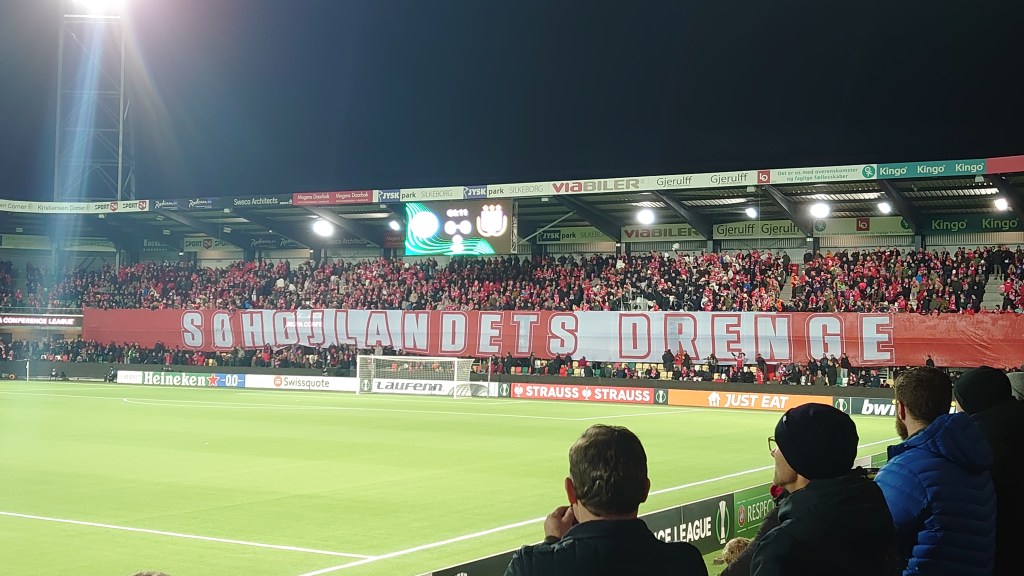 On arrival at JYSK Park we were met by stewards looking to earn their money. A first for me happened when I was IDd. The combination of American accent and North East teuchter accent obviously set off alarms and we were pulled out the queue and questioned. It seemed as if they thought we were Belgian. After a brief discussion and explaining were just wanted to watch a game while in the country for work we were allowed in. A strange one for sure, a bit too vigilant too if you ask me. With a a bit of time to burn it would have been rude not to partake in some pre match boozing in the fan bar outside the ground to get a feel for the atmosphere. It was hard to tell what it would be like, there were plenty of fans kicking about, there was a decent noise emanating from inside the ground and with all to play for between the two sides it had the makings of a good night. Once in the ground the Ultras were in full voice creating a decent racket and display was unfurled as the teams came out the tunnel. But where were the Anderlecht fans?