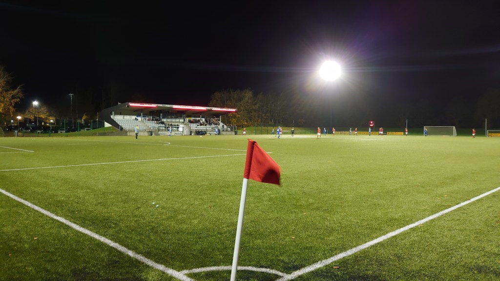 The game wasn’t littered with big chances but it flowed from one end of the pitch to the other under a constant gentle rain of falling orange and brown leaves. Both sides had dipping long range efforts that went just over the bar before any keeper was tested, The first time a keeper was challenged to make a save was when the Bække custodian got down to block an effort from Uhd but could only send it in the direction of the onrushing Tobias Sadova who lashed the ball into the roof of the net from 6 yards. This got Skovlund tails up and they took the game to their opponents but to be fair to Bække the stood up and defended well. Against the run of play the equaliser came when a great ball in from the right from Max Hedeager made its way to the back post for Michael Schmidt to blast into the top corner from close range. This creating a huge cheer from the stand which showed that most of the almost hundred in attendance were there to see the men in blue and white.