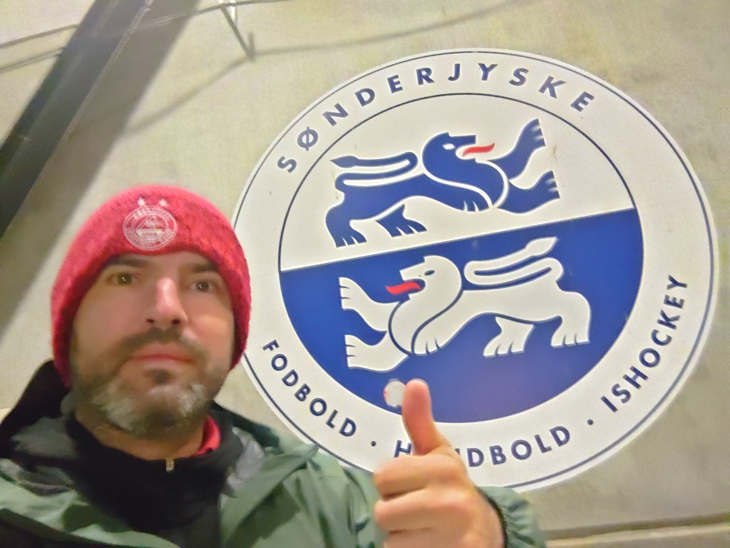 During the match my Aberdeen tourie got attention and I got speaking to Jesper Jensen an extremely affable man who used to live in Aberdeen and worked in Milltimber. He had also visited Pittodrie a few times inclusive of when we beat a strong Manchester United in ’99 just before they won the Champions League. The football chat with him far outdid goings on on the pitch for entertainment. He explained a lot about the club and why there are so many kids going about. On that subject I have never seen so many kids at one game. A very high percentage of the crowd in this compact wee ground were youths and it it is great to see. Even greater that the reason behind it is that SønderjyskE let them in for free. This due to if they train with a local club they can watch for free. In the long run this is a great way to gain support for a club. The formation date of the club may be reasonably recent but they have a long history with the original club Haderslev FK dating back to 1906 prior to the multisport club arriving 18 years ago. The old crest is seen all around the ground, on the walls and on the stewards jackets etc and there are still people wearing garb that can be seen too. Speaking of crests, the SønderjyskE badge on the scoreboard was only half present, but on further inspection it was clear that the scoreboard due to its placement had been twatted by errant shots a few times. As you can see I was paying attention to the game. The chat of football went further than just our own teams and on to football in general whether World Cup, Brondby being shit and just anything on the game really. It went on through to the moment Mucolli stepped up to hit the winner which funnily enough Jesper predicted was going in as soon as it was given. Once the net rippled Jesper wished me well and left and that was about that for the night. Terrible game made good by great company all because of my hat. Not a classic.
