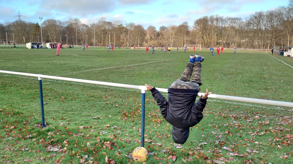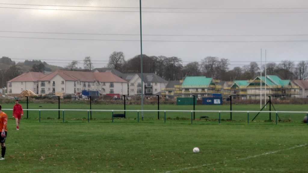 Pre-game was simple. No shenanigans out and about for us. Wee Man told me he wanted to watch Tunisia v Australia. So that is what we did prior to our arrival at an Autumnal Woodside. The game opened with the Glens on the front foot for the opening quarter of an hour but there was never a threat to Ryan Brindle in the Vale goal. Glentanar were getting the balls into the box but the front men never seemed to anticipate. In amongst this I spotted a stonewall penalty when Vale defender Brendan Aitchison clearly handled in the box. I thought it was blatant but only one man in blue claimed which I found incredible. Wee Man and me were adamant it was a pen, but with no VAR it remained 0 v 0. The game was stuffy to say the least and the highlight came from one of the Vale punters, who returned a stray clearance off the pitch with a booming header. Pitch wise the action was low but there was one moment of controversy when after collecting the ball, Glens keeper Rose was clattered exceptionally late by Vale number 11 Scott. It looked to be a shoulder barge/stand on ankle. The fact his ankle was trapped as he was going down it led to a lengthy injury break and also led to the keeper hobbling for the remainder of the match. But incredibly there was no punishment for this belated foul. Strange one but in all honesty it summed the referee up as he didn’t look arsed all game. Very slow in keeping up with the play throughout. The first big chance of the game fell to Brodie Christie who flashed one past Rose but also past the post. It was around this point I noticed the amount of trains that pass this place. As stated earlier I have been heading to this neck of the woods(no pun intended) for a long long time, but ever the observant me had never noticed it before. On the other hand i was informed at FT that 10 trains had passed. Not all of us are oblivious. Before the half was out Glentanar defender Rennie was kicking himself after he saw a glorious chance to head his team into the lead go inches wide.