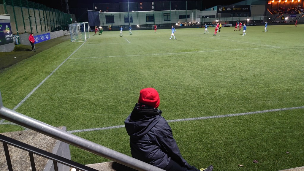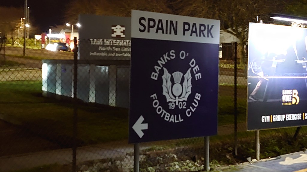 A familiar old haunt for us but not the usual hosts. So familiar for Wee Man, it goes even with Pittodrie as most visited to date. I was interested to see how many would show up to this. I was surprised to see such a healthy crowd when we walked in and we were early too, early enough to have a fair old game of the inevitable tyre game that has become customary on a Spain Park visit. I may have remained unbeaten in that over the night, however the little dude got a bigger win and guessed the correct score, meaning he is now in the lead for the season. But the score actually seems bizarre given what happened on the park. It was not a four niller. I would say the Bankies deserved the win but not to the extent they did. The game started with a bang and within the first minute the visitors were in the lead. A quick turnover saw a cross from the right met by Chris Davidson who struck home from a few yards. It looked far too easy. The Dee were caught cold. If that didn’t hurt then the fact that before the time had hit double figures Sunnybank had grabbed a second through Mikey Taylor. There was a definite similarity to the first barring being crossed from the left this time. Eighty one minutes to go and the young Dee side were already facing an uphill struggle. But to be fair they gave it a go and continued to try and play football throughout but only tested Myles in the Sunnybank goal once in the game. On saying that his opposite number Neish made one save of note in the ninety. Picking the ball out of his net was the most work he did. Staying on the subject of keepers I am positive there was a stonewall penalty denied for the home side when Myles came to punch a corner but got it all wrong and smashed the Dee forward square on the canister before wiping out his own defender. As clear a foul as you would see but the referee ignored it. Then once the two injured parties were back on their feet after a lengthy stoppage, the Dee should have had another penalty when Louis McGarrity was on the end of a red and white elbow. I missed who it was as I was looking at McGarrity hitting the deck as the crack the connection made actually had me concerned. Again a stonewaller. Then to make matters worse the referee gave the most innocuous of fouls straight away for a shoulder on shoulder challenge. Punching and elbowing fine, shoulder to shoulder bad, is that how the game works now? Back to McGarrity, the Dee man was off the park for a full 10 minutes to stem the blood from his nose before returning just as the half was in its death throws. Banks o’ Dee had their biggest chance of the match on 45 when Scott Milne broke into the box, the shot was on but his delay led to him running out of pitch, however he got the cross in at the last second. At this point it looked like 1 v 2 but his strike partner Rothnie seemed to get a head of the ball and his unorthodox effort went over the bar from around three yards.