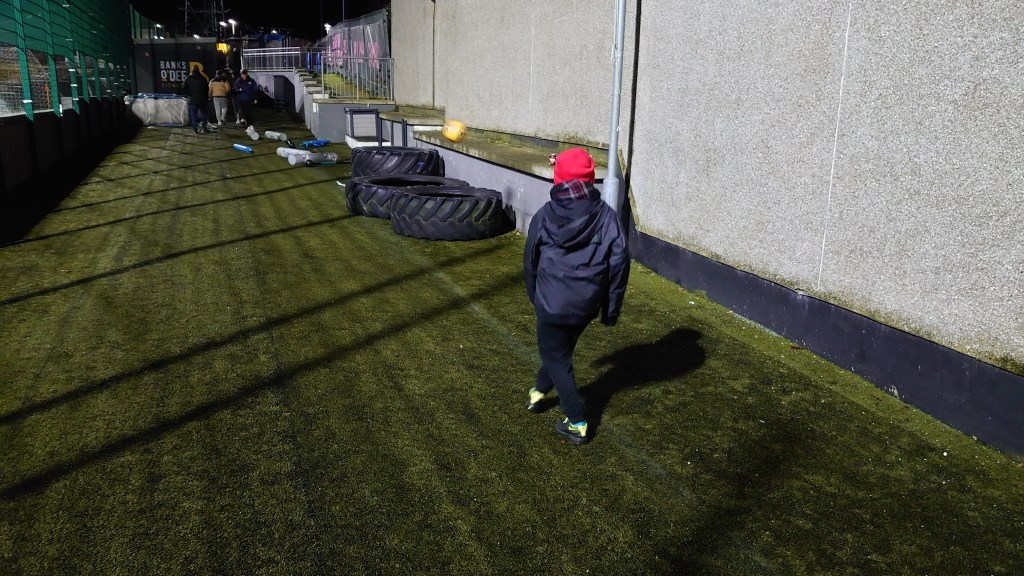 More tyre game came at the break this time coming out at a pulsating 5 v 5 draw. Before hand I said we would get a pie and a coffee before playing as there might not be any left after. No no, I was in the wrong and the pie was secondary and I was told to play. Then when going for a pie at the start of the second half, there were no steak left for Wee Man and he gave me a row. Bloody kids. The second half was much and such the same but without the early goal. It took Sunnybank around 15 minutes before they grabbed their third. This time Adam Reid was the man on hand when he cut inside a placed a decent finish across Neish. The game was looking dead an buried at this point. The Dee had a huge chance when Osprey broke into he box and fired low into Myles’ left hand corner but the keeper saved and the rebound seemed to have a game of pinball in the box before being cleared. Neish made his only save of the game soon after when he was stretched to prevent a decent effort from Ciaran Bloomer. The Dee had one final big chance when Milne found him bearing down on goal but took to long and too many touches and failed to get an effort away. This being a common theme throughout the night as discussed a few times with the Rothie Rovers men Kev and Grant who were in out company during the match. The Dee seemed to overplay things at times when there were simpler options available. On saying that there was definitely a bit of respect to the home side as they did stick at their game plan of trying to play football. It seems to be the ethos of the team. But on the night it came to nothing and experience beat it. Sunnybank were not finished on three and with time almost up a decent passage of play culminated in substitute Kieran Munro finding himself clean through rounding Neish and tapping into an empty net finishing off a good nights work for league leaders. The score may seem like Sunnybank steam rolled Banks o’ Dee but this was not the case. It will take a gargantuan collapse to not see the Bankies in the Superleague next season one would think. A return eleven years in the making for this one time giant of the Northern Junior game.