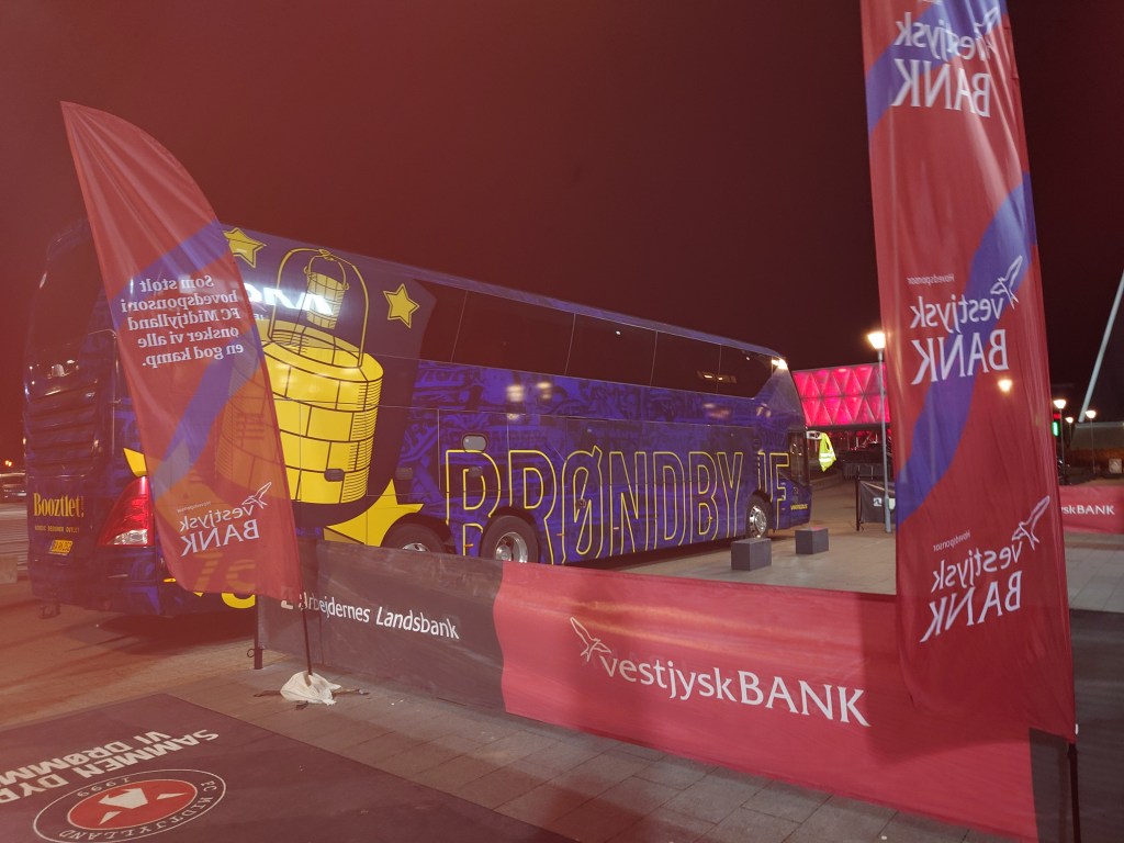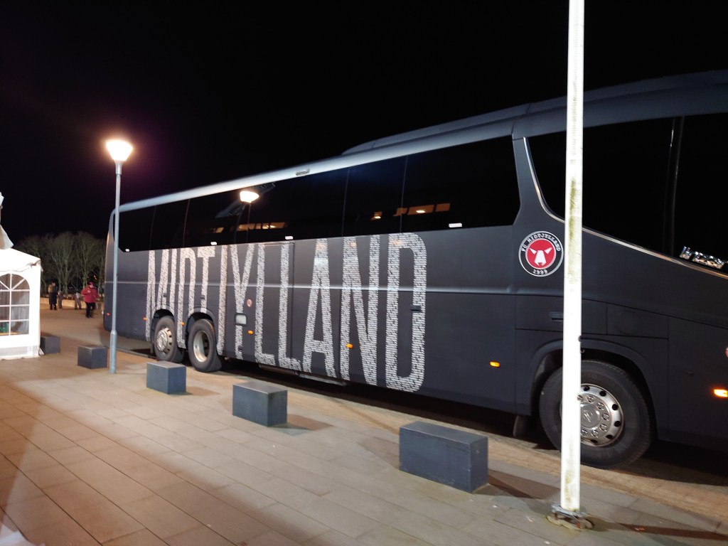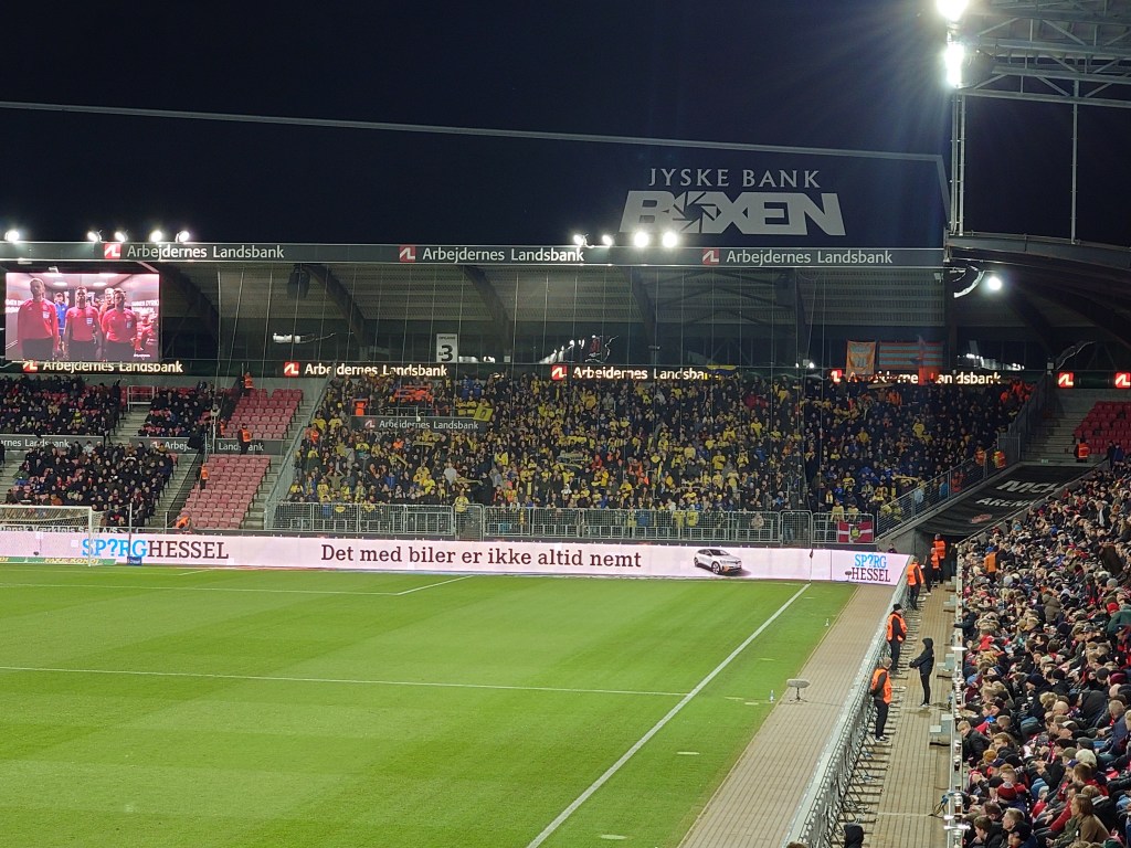 With my work having a no flying on the same day as your chopper rule, I had a night in Esbjerg before heading offshore. With a quick look at fixtures it was clear another night in Herning beckoned. This for the third time after previously seeing them batter Lazio 5 v 1 and grind out a 0 v 0 with Nordsjaelland in the past. The difference this time being I was to get the train up as opposed to lifts or taxis. This meaning after a couple of beers in the town I started the walk to the ground. What a trek it was too. Not a fan friendly location for a newbuild. I left the pub at 18.00 and got there 5 minutes shy of a 19.00 kick off and that’s me with huge fast strides too. But i finally reached the glow of the floodlights and after grabbing a hotdog I found a space in what was a packed terrace facing the sea of yellow Brondby fans, who were making a decent racket. As were the home fans who werent to be outdone. It was shaping up to be a decent evening. The game was strange though. It was entertaining yes, it had both teams attacking, each with a host of chances but they all seemed to go over the bar. Midtjylland more guilty than Brondby who did sky a few efforts themselves. The keepers were having it easy on the night. The biggest touches for either were both for Hermansen in the away net. One when he pulled off a decent stop from Isaksen. The next when he picked up what was a clear pass back in front of us which was inexcusably waved away
