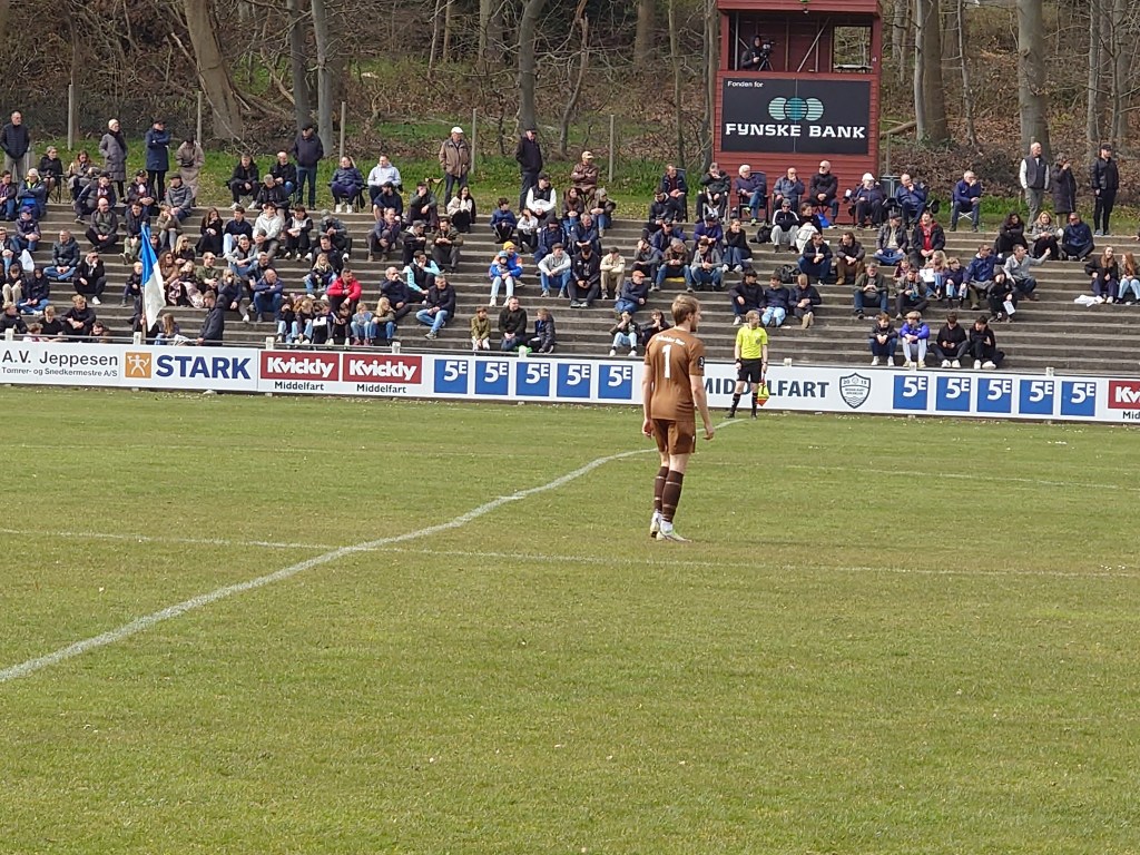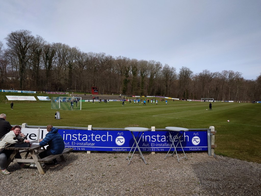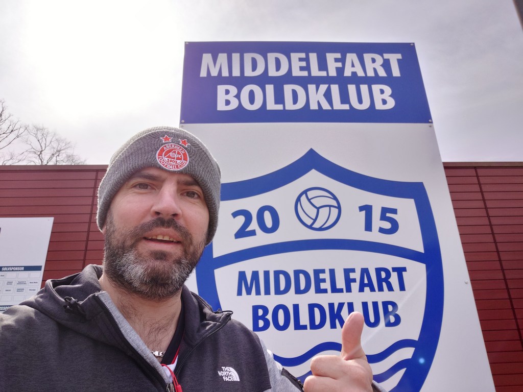 Sometimes you get lucky with stuff and football can fit into that . Heading to Middelfart for this match was one of those times. What a fantastic experience. A 50 minute train ride from Esbjerg after some boring stuff and I was out of Jutland and in the next Island of Funen. With little time to spare I had to head straight to the ground without any touristy stuff. After finding out I could not pay at the gate and had to download an app to get in I got the full wow factor of this marvelous little ground. It’s a simple ground with one terrace on the wing but on the eye it was a cracker. Surrounded by trees and seeming to be dug down into a wood, I was immediately a fan of this place. This was even more so after I got speaking to locals who greeted me and thought I was a bit mad to choose a fourth tier game when there was a top flight card on. It’s all about distance though and it was close enough to Esbjerg for me to make it on time. But the trusty Aberdeen tourie worked its magic and got conversations going with the very affable locals.