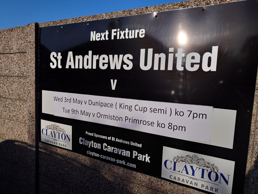 A lot of our football recently has found us not too far from the door, this mainly due with Juniors North Region Junior quest. At the weekend the Wee Man asked if we could go a bit further this week. Never an issue to me and with a quick squint of the fixtures I spied a big game for St Andrews United, somewhere that is not too far for a midweeker (got to love the AWPR).