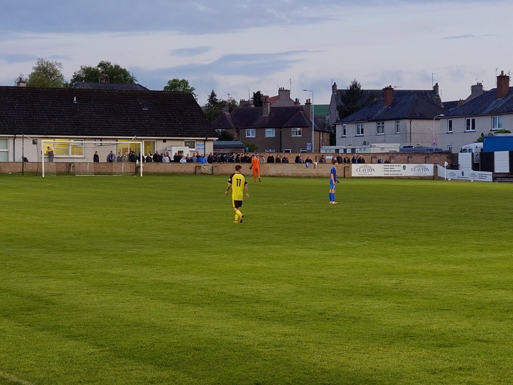 So to the historic town on the Fife coast we found ourselves. A town more known for people wasting good walks than it is known for fitba. But the town is home to one time champions of the Scottish Junior Cup and the delightful Recreation Ground. Delightful in the sense it is a quirky place. Especially the pitch with the slope being apparent as soon as you walk in. We have visited many a slanted parks. Tarves have the ski-slope trajectory pitch, Bonnyrigg have the wing to wing tilt, Beith have the slope induced growing sponsor boards but St Andrews seem to have a moguls run with its multiple multi direction slopes and valleys across the whole pitch. I don’t mean this in any derogatory way at all, its just the facts of the place, to me it adds great character to the Rec,which as of this season is worthy of a Scottish Cup entry with the Saints now licensed. The team that play on it are not too shabby and tonight was a big night as a win would see them promoted to the second tier of the EOSFL. It was a job that as I tucked into my first lovely peppery scotch pie in the opening minutes, I realised was not going to be hard to pull off as the home side were clearly superior than Ormiston. Twelve minutes it took for St Andrews to take the lead when Micheil Smith swung in a corner which was beautifully met by Ryan Sneddon who directed his header perfectly from a tight angle (to be noted I originally thought this was Dignan who scored but the Saints have the same issue that I complained about with Hermes. Black numbers on blue shirts, pain in the ass to make out at times). From here it continued to be one way traffic with a few chances created by the Saints. But it was beyond half an hour before a second was added when Dignan (definitely him this time) was left with a tap in after Primrose keeper Gordon came to collect after shouting, his team mates stopped to allow him win the ball, however he dropped it and his defence were all flat footed unlike Dignan who tapped into a largely unguarded net. This much to the delight of the young team. A group of wee kids with home made flags, a saltire and a drum which was made out of what looked like greaseproof paper and a plant pot. This played with spoons. As the Saints celebrated their second the “ultras” song for Primrose was “you’re just a fake Borussia Dortmund” as the visitors were in yellow and black. This to the amusement of Wee Man, myself and Mark who we spent the guts of the game with. The half time whistle went and I was clear this was only going one way and was not to be much of a spectacle, just a professional job by St Andrews. To the extent that Wee Man was more interested in keeping us updated with the SPFL playoff scores than what was happening on the pitch. Which is not a bad thing in all honesty as its great to see him having such an interest in Scottish fitba as a whole.