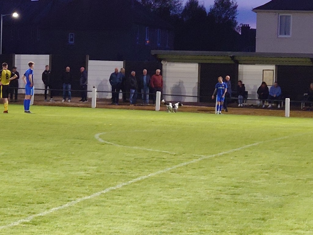 After a wee knock about of the ball we stayed at the opposite end from the first half given St Andrews were to be shooting at it and the chance of a Primrose goal was slim to none. I am not even sure Brodie in the Saints goal had touched the ball in anger up until this point. It wasn’t long until Brodie’s opposite number was picking the ball out of the net again when he saw a twenty-five yard effort from Dignan beat him into his right hand corner. This was surely game over. I was hoping it was also scoring over as I am lagging behind Wee Man in the season score predictions and I had 3 v 0 tonight. Unfortunately for me the Saints added a fourth and it was another tap in for Dignan to seal his hat trick after some poor defending. This giving Wee Man another notch in his predictions for the season. Leaving me trailing him by 3 in May, it is not looking good for me as time is now against me. That was the game dead and buried but the Saints still went for more. They just did not come. I was impressed in the second period by Mitchell Sharp. A very direct player who looks like he glues the ball to his foot, a very tricky player which was clear to see despite a brief part in proceedings. One thing I took from the match. The ball was rarely off the deck from either team. St Andrews were better with the ball and Ormiston didn’t offer much but both teams tried to play good football throughout. Despite the fourth goal killing the game stone dead the action was not over yet. A spectating dog was struck with the ball, so hard that Mark and myself were worried for its welfare. We need not have worried though, as around twenty seconds later it tried to head the ball back into play as it wagged its tail manically. But it didn’t quite get things right. Not to be left out of being star of the show, it escaped it’s lead and got on the pitch. holding up the game until Brodie caught it and didn’t just remove the pooch from the pitch but chucked it in the changing rooms. A bit of amusement to end the match before the Saints celebrated promotion up the pyramid.On that, the Saints are a prime example of why the conference bullshit idea can get in the skip as soon as possible. They have ambition, got themselves licensed and now promoted up a tier. Yet will find themselves relegated down a tier if this monstrosity of an idea comes to fruition. Only in Scotland could teams be made to jump through many hoops only to be screwed in order to suck up to two teams. But I digress. On the way home Wee Man said ” I have seen a lot of teams that have St. in their name”. Turns he has seen ten different clubs with the moniker , surely outnumbered by Uniteds and maybe Thistles. I’ll work that out at a later date though.