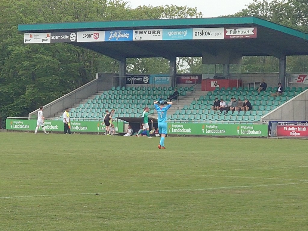 It turned out to be a wee gem of a place. One of the best if not the best lower league ground I had visited in the country. With a stand which would house about 350 on one side and a dug out/stand on the opposite wing I was immediately impressed with the place. On the theme of dug outs the Stand side home dugout was a beauty as it was a proper dug down dugout. Very old fashioned. I was told in the pub that Skjern is a predominantly a Handball town. Well if this was the lesser fancied fitba facilities then I would love to see the Handball (which were in the sportspark right next to the ground). A great place to watch a game for sure, however the night was to be about the stadium rather than the fitba as it was a total non event. As one sided a contest as you could see. Incredibly it took 30 minutes for the first goal. First goal that counted that is as Daniel Rosu had the ball in the net only to be called offside. Rosu also had two big chances in the first half hour where he really should have been finding the net but on both occasions seemed to be caught in two minds. Inevitably though it was Rosu who opened the scoring when he was left with a tap in from a few yards after some brilliant play on the wing from Stephane Sorensen. It was quickly two when Magnus Pagaard took a super touch from a Sorensen cross to stop the ball dead to lash home from close range. Just as the half was looking like ending Mads Smedegaard Hansen went on a jungle run and past a host of players to slide the ball into the bottom corner. A very good solo goal. This was then followed up by Rosu grabbing a brace as he volleyed home a Allerslev cross. It was pretty much game over by the time the ref blew for the break.