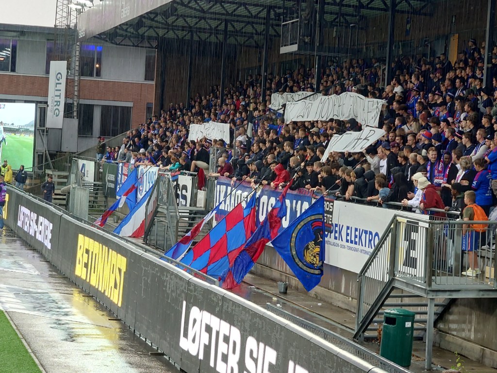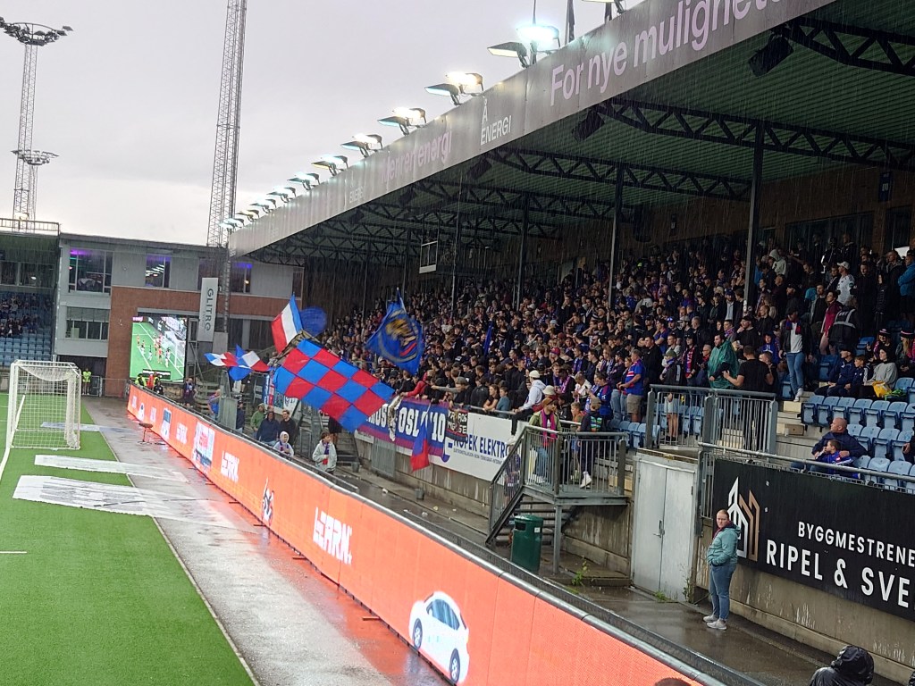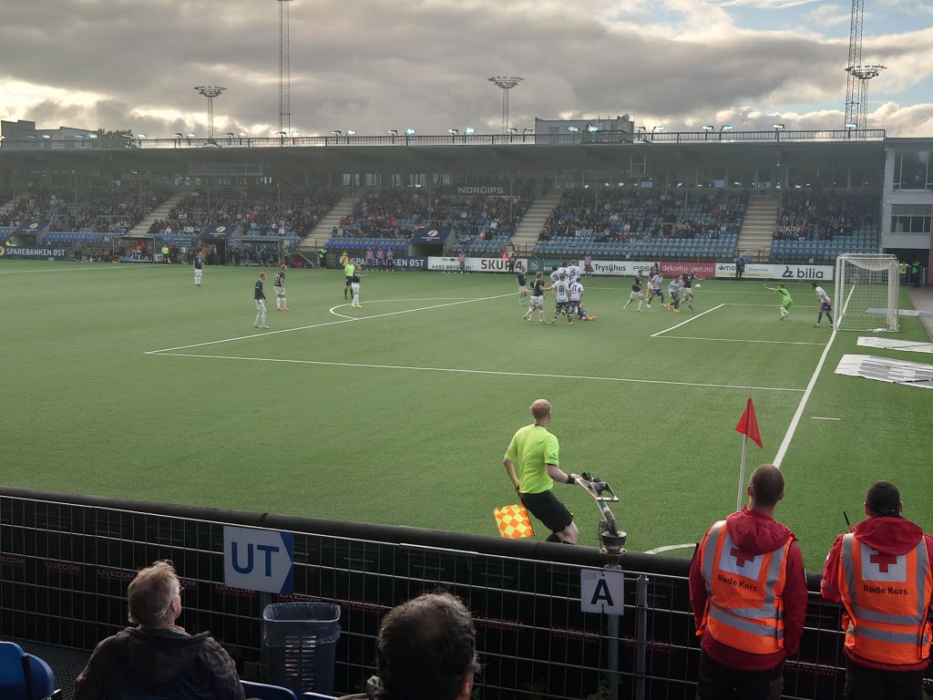 The first thing of note on entry was two scarves cost me £36 quid. Dearest to date, I am more than sure about that. The second was the impressive travelling support numbers and the din they were making. But it was not to last. This because we witnessed something I have never seen in all my days. A silent protest. From both sets of fans. From the first whistle until the 15th minute. It was a strange time. I even felt the Godset goal wasn’t celebrated fully when Brunes netted in the eighth minute. There was an almost eeriness to it all but great to witness. As was the thunder and the rain falling which eclipsed what we heard up the road earlier. It was rumbling intensely, I was waiting for some Dave Lombardo drumming to kick in. But nothing was as great as the aftermath as when the 15th minute struck, both teams ultras lit up in style and smoked the place out with some brilliant levels of pyro. This with the atmosphere being electric at both ends of the pitch. Again for a second day in a row Wee Man was delighted to see it all unfold. As stated Godset went up 1 v 0 early on. This coming from a howler from Vålerenga keeper Storevik who rush out to clear but miss hit straight to Jonatan Brunes who immediately chipped the ball back over him fro 35 yards. A decent finish but awful goalkeeping. They also should have doubled the lead when Sondre Hanssen headed a set piece wide. Target at least was surely the outcome but no. The same can be said for Bjordal for Vålerenga who walloped an effort from the edge of the box wide. There was no excuse for not hitting the target. Petter Strand was next up to with an effort for the visitors but it was too close to Mhyra in the home goal. As the half was exhaling its final breath the Oslo side did breach the Godset goal when a rapid fire break saw Ofkir gallop through on the left to fire across to Hakans who tapped in at the back post. An incredibly quick breakaway goal with the last kick of the half.