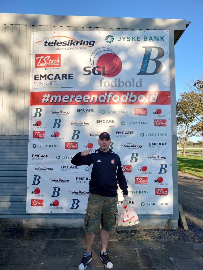 Interestingly this lower league affair with customary bag of cans ended up a double milestone as it was game number 100 out of the confines of Scotland, but it also the 300th blog piece I have written. Unlike most matches I get to in Denmark as I was in the company of two others who I had managed to drag out in the scorching Nordic sun. One being Sebastian who has appeared in these pages previously. The next was Ardrossan Winton Rovers season ticket holding Mike who I had only met on the day in the heli-lounge that day.