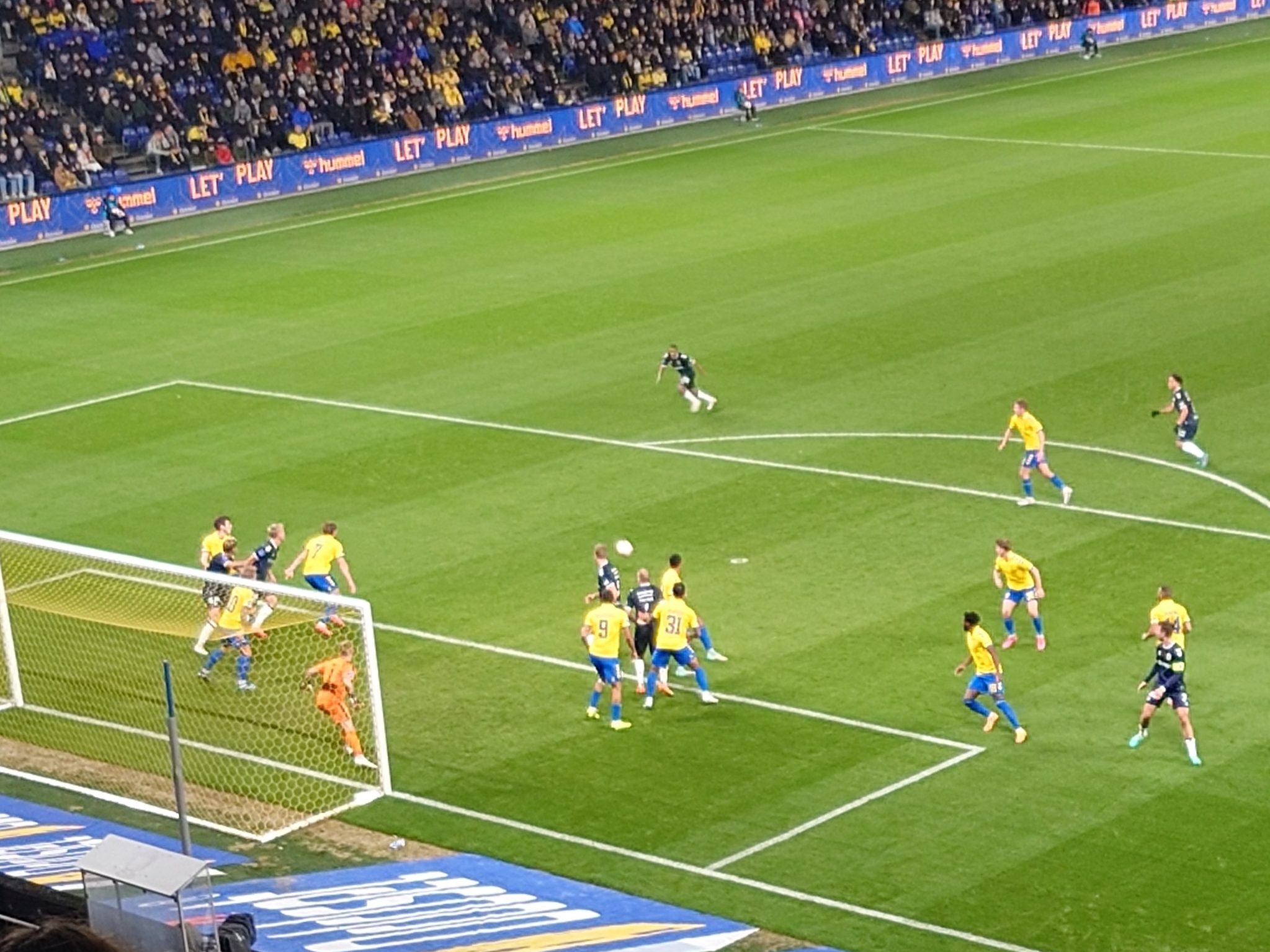 In through entrance H I headed and was greeted with a sea of yellow and a cacophony of noise. To be fair to AGF fans this was partly helped by their noisy band of merry fans who were constant through out. But it was the home ultras in the opposite stand that impressed me. What a way to support your team, I wont be able to do them justice. Loud, colourful, non-stop and just bloody phenomenal. I always had Feyenoord top of the pile but they have been well and truly ousted. If I was to write my book now the first chapter included would have been on this match. I took my berth at a handrail at the back of the bottom tier. It gave a good view of the pitch and also allowed me to hear the travelling Aarhus fans to my left. The cheer for kick off was raucous, the cheers 6 minutes later was even louder when the home side took the lead through Nicolai Vallys who tapped in from a couple of yards out. My position gave me a great view of the assist from Daniel Vass. I may be wrong but his thirty yard ball into the box looked to be a world class work of art. From more to the right of the park he arrowed a ball just beyond the penalty spot allowing Vallys to step on to it and fire home. I haven’t seen it back yet but it looked brilliant. This didn’t upset AGF at all and they kept about their business. Brøndby seemed to be the better passing side but AGF created more chances but, not huge chances but they were trying their hand. As the teams tried to suss each other on the pitch, goings on off it were continuing to be great. With the Ultras and more rambunctious supporters housed in the Sydsiden they were conducting the other three stands by demanding a chant returned to them while the whole stand pointed. First the GSV Tribunen, then 3F Tribunen and lastly where I was housed, the Stavnskær Elektrik Tribune. It was an amazing site and it was followed by the three stands at once asking the Sydside the same. Quality fan action to watch unfold. At this point I was moved by a steward from my handrail so I grabbed my real seat on the upper tier. What a view you get from up there of the ground. One which I am a big fan on. It wasnt quite full but it mattered not. The atmosphere was electric. Back on the pitch the were a couple of chances pulling out saves from both keepers Pentz and Peacock-Farrell in the home and away goals respectively but the score stayed in favour of the hosts at the break.