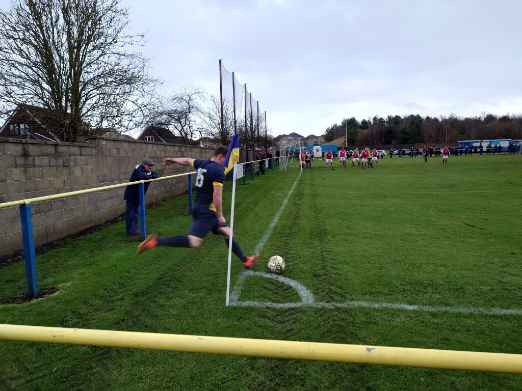 After seeing Broxburn a few months ago and noticing they were still top of the league both of us expected an easy day for the visitors. The score line suggests it was but its not the full story. We grabbed a pie and a coffee and randomly spoke to other Aberdeen fans who were in attendance behind us in the queue. The guys only spoke as Wee Man had an AC Milan hat on and the elder of the two was also a Milan man. A wee Dons/Serie A related blether and we were on our way to grab a space to watch the game. As said it looks an easy day for Broxburn but it was the hosts who were the better side for large swathes of the first half. It was a tight opening to the game but Primrose looked the more threatening. The fact the home keeper Shaun Hunter was still pristine in his mint coloured get up said a lot about the direction of the pressure. The first clear chance fell to Broxburn though as a ball in to the box found Errol Douglas who got his header all wrong leaving Hunter to stay clean for a bit longer. Crossgates had the ball ball into the box a few times but failed to test Watt in the opening twenty despite the pressure. However, the keeper was diving across his goal on 24 minutes only to see the ball kiss his post and hit the net. This when a short defensive header landed at Craig Reid who struck from 25 yards through a host of bodies and out of reach of the keeper. A deserved lead for Primrose. As the home side celebrated I watched the fall out at the back for Broxburn when I realised St Johnstone’s record appearance holder Steven Anderson was playing. After a quick look up it turns out he was at Crossgates prior to Broxburn too. Broxburn seemed to be perturbed by conceding and came more into the game. The were unlucky not to equalise soon after when Gary Brass struck the bar from close range. He seemed to hit it too hard only to see it strike the woodwork and away to safety. A let off for Crossgates none the less. This was followed by another big chance for Broxburn when Callum Heath showed an awesome burst of pace to nip into the box beating every defender to the ball but his quickfire effort was blocked on the line. It was Heath who did finally stick the ball in the Primrose net when he rose brilliantly to head a Nimmo cross into the net giving Hunter no chance. A well worked goal celebrated with a cacophony from the travelling fans who made their presence clear as the net rippled. This probably deserved as they had the better of the final 15 minutes.