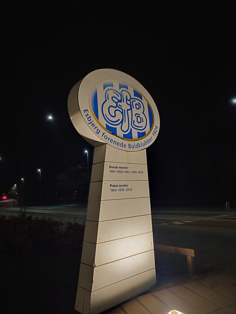 Day two of no chopper and day two of being sent to bloody Billund for a hotel(its the guts of an hour a way). After finding out the hotel in Billund is shite on night one I decided to stay in Esbjerg to find a game. As it turned out there was derby between two teams of the same name (this being the second time I have seen this, I have also seen Skjern (1) v Skjern (2) in the past). This was to take place up at the fantastic EfB clubhouse. The game was to include my pal Kenni Poulsen. A quick message to him and it turned out he was not going to be there but it was at the usual place(I had watched them a few times before). Then only few minutes later he sent a message saying he would be in the squad for the first time since October and would be rusty, but it would also allow a blether and a chance to give him his book which I promised a while back. As I arrived for KO Kenni came round to greet me. Talk of all things EfB was had (they are in administration and there is an upcoming court hearing), the Highland League (told him to forget about English football and get across to the HFL) and the team on show on the night. (There were no van der Vaarts or Internationals but there were ex Superliga, second tier and elite youth players kicking about in the (1) team). While we were chatting his team found itself down via a minging deflected goal which wrong footed the keeper Christian Ole Marker. It was quickly two when Marker cost his team by getting down too slowly and letting a shot from the edge of the box under him. I am sure the ball was in the net before he had even dived. The deficit was halved soon after when Mads Jensen buried an effort in the bottom corner from the edge of the box after a through ball split the defence. It was almost 2 v 2 immediately if it was not for a last gasp clearance off the line. The equaliser did come though. This when Michael Behrendsen smashed home an uncontested penalty. It was a stonewaller in my eyes. The game was end to end and enjoyable and a fifth goal of the half came when a ball over the top of the (1) defence allowed (2)s wee number two in to slip the ball under the onrushing Marker to re-take the lead. It was that man again who reinstated the two goal gap before the half was out when another ball through left him one on one where he rounded the Marker with aplomb. A very tidy player. Again for the second night in a row I had witnessed 6 goals in a half but in this occasion it could have been a lot more with numerous chances being missed as the World Cup finishes were attempted. A bit of calm and precision would have seen the score much higher.