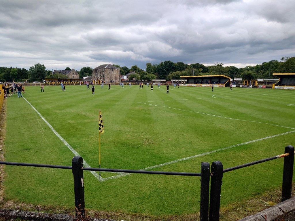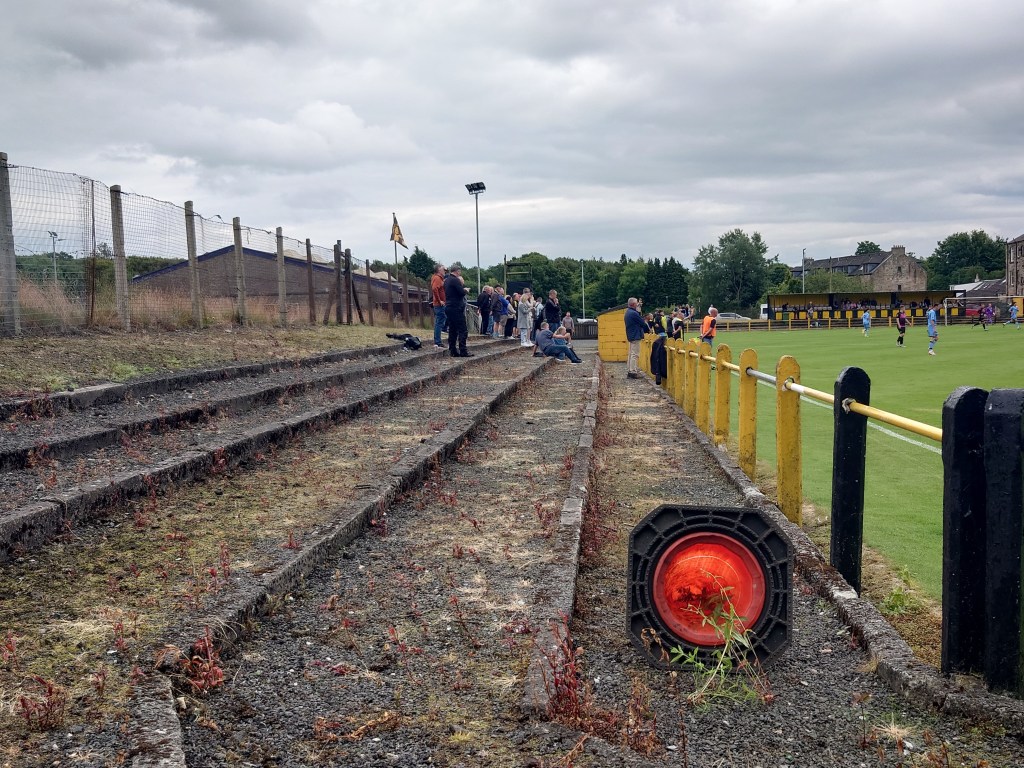 Turning up to a game in Scotland without my sidekick doesn’t seem right these days. No ball, no double pie orders, no hundreds of questions, no big bag of sweeties and no pocket full of his litter. But of all the places I could have ended up the quality of it made up for the lack of Wee Man. The ground ticks many a box. Firstly there is a bar and their pies are full of steak. But the ground it self is great in my eyes. There is the remnants of old and by that I mean the terrace, Although needing a good weeding behind the far goal especially, it just adds to the great character of the place. In an old fitba romantic kind of way an old weedy terrace appeals to me. They have been there longer than the fans and know more of what has happened on the park than everyone if that makes sense. On the park, the pitch looked in brilliant nick and a joy to play on. On one wing it has as good as identical stands which in itself is a quirk but they are decent bits of kit and painted in the clubs colours make them stand out and add to the place overall. Behind one goal is a fabricated container stand that is fully seated painted in the club’s colours which seemed to have the quieter fans with the kids. Then there was the folk I spoke to, although all brief conversations , they were all friendly and nice folk, despite a couple of initial funny looks when my Aberdeenshire accent was heard. Just a sound place for a game of fitba overall.