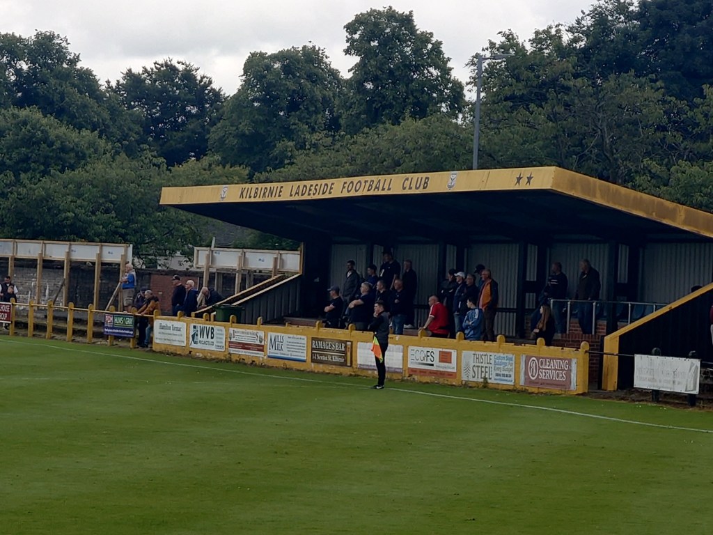 The game was a bit one sided though. Largs looked very good from the off and played some really bonnie fitba throughout the game. In a game that although was a friendly had a high foul count and was full blooded too. All good in my book. Largs were the more threating and their first chance fell to Davidson who ballooned and effort over the bar and the wee stand. This was followed up by what was a rare Kilbirnie chance when Greg Ferry headed a freekick wide from a handful of yards. Two minutes later it was 0 v 1. An initial corner was cleared by the Blasties defence, the follow up corner found McGrath at the back post to knock it home. Largs continued to go at Kilbirnie and took advantage of the great pitch and knocked it about at pace and with great accuracy. It was magic to watch at times. The second goal came and again it was from a corner when a defensive clearance landed at Stuart Faulds who thumped the ball to almost bursting point through a cluster of bodies and into the net before McGowan in the Kilbirnie net could see it. It was also one of those efforts that let off a pleasing audible thump that echoed around the ground. This second goal increased the volume of the locals who were clearly not happy with what they were seeing. “Get your fucking finger out Kilbirnie” soon echoed around the ground just like the shot that led to the shout.