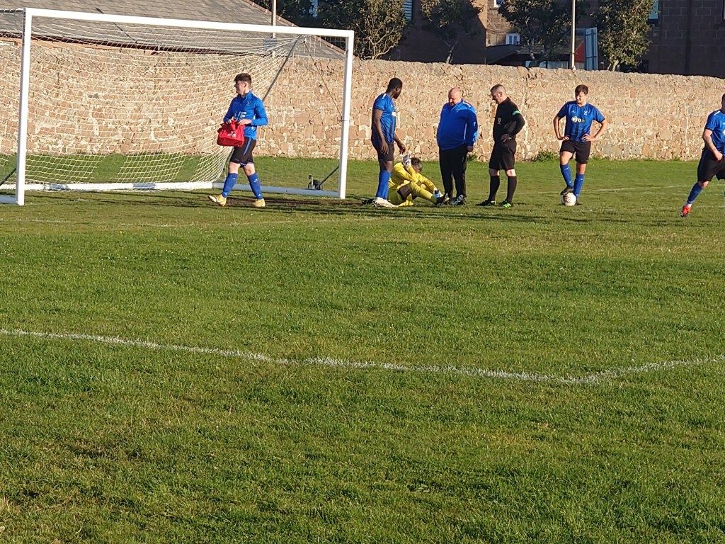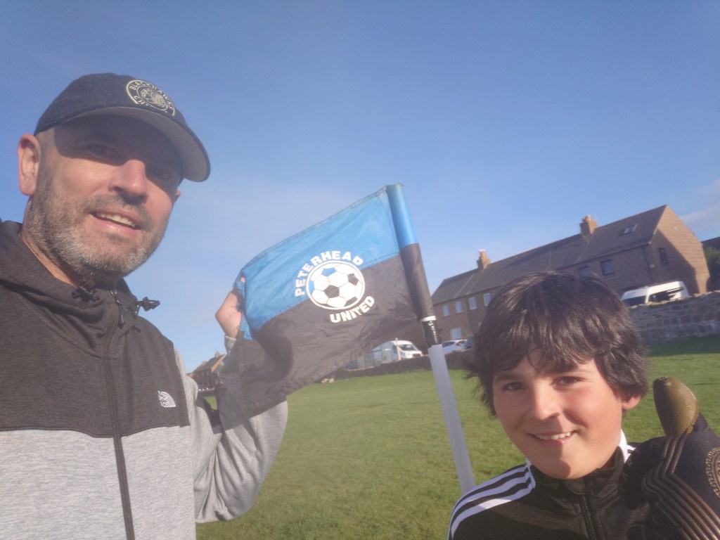 For Wee Man it started brilliantly as there are mini-goals next to the pitch and he had his gloves with him, meaning, 25 minutes of me smashing shots at him pre-game and him getting filthy. On the pitch the it was the visitors who started well and dominated proceedings for as good as the first quarter of an hour passing up a couple of half chances in the process. But the first clear cut effort fell to Peterhead United’s Josh Strachan who from point blank range undercooked an effort straight at Murray Green in the Town goal. This was quickly followed by a Jamie Benzie effort for Cuminestown which just lacked the required dip to bother Emslie in the Peterhead goal. Emslie was then called into action to make the save of the match when he was at full stretch to his right to get no more than a finger tip on an effort that bounced in front of him but it was enough to send the ball onto the post and away to safety. No sooner had he dusted himself down he was again on the ground, this time with his game over for the night as he was clattered by Town striker Marc McLaren, who I will add was as entitled to go for the ball as the keeper, it was just one of these unfortunate collisions in fitba. (It was during this long delay I noticed a ex-team mate of years Billy Dailly playing for the home side. Fair play to him, surely 40 now)Ryan Leys was to replace the keeper and the makeshift goalkeeper was to pull off an decent early stop to prevent McLaren. But only a minute later the Cuminestown striker managed to find the net when he was left in too much space mid box to nod home an effort which seemed to head into the top corner in slow motion. The home side should have equalised when Robertson struck an effort when unmarked but it was too close to Green who dealt with it with ease. The home side did then equalise , this from a penalty when the ref was quick to point to the spot after an uncontested infringement on Strachan saw the nippy striker tumble. DJ Strachan buried the kick getting it caught in the stanchion to make it more aesthetically pleasing. But they failed to stay on level terms for long as Cuminestown swiftly had the ball in the net again. This when Struan Morrison stuck a toe out to divert a cross into the bottom corner dinking the post on the way in. A classy deft wee finish it was which I doubt any keeper was saving. However, was he in too much space to get the effort away? Again, Peterhead United should have equalised but failed. This when Jamie Dorta managed to hit the bar from a couple of yards out. He really should have been making a hole in the net from that range. The leveller did come though, and it was from old head Kevin Norris who lofted a free kick into the box, only to see it cleared and he stepped on to the clearing header sending the ball perfectly through a plethora of bodies and into the bottom corner. A very tidy finish to put the teams into the break even Stevens.