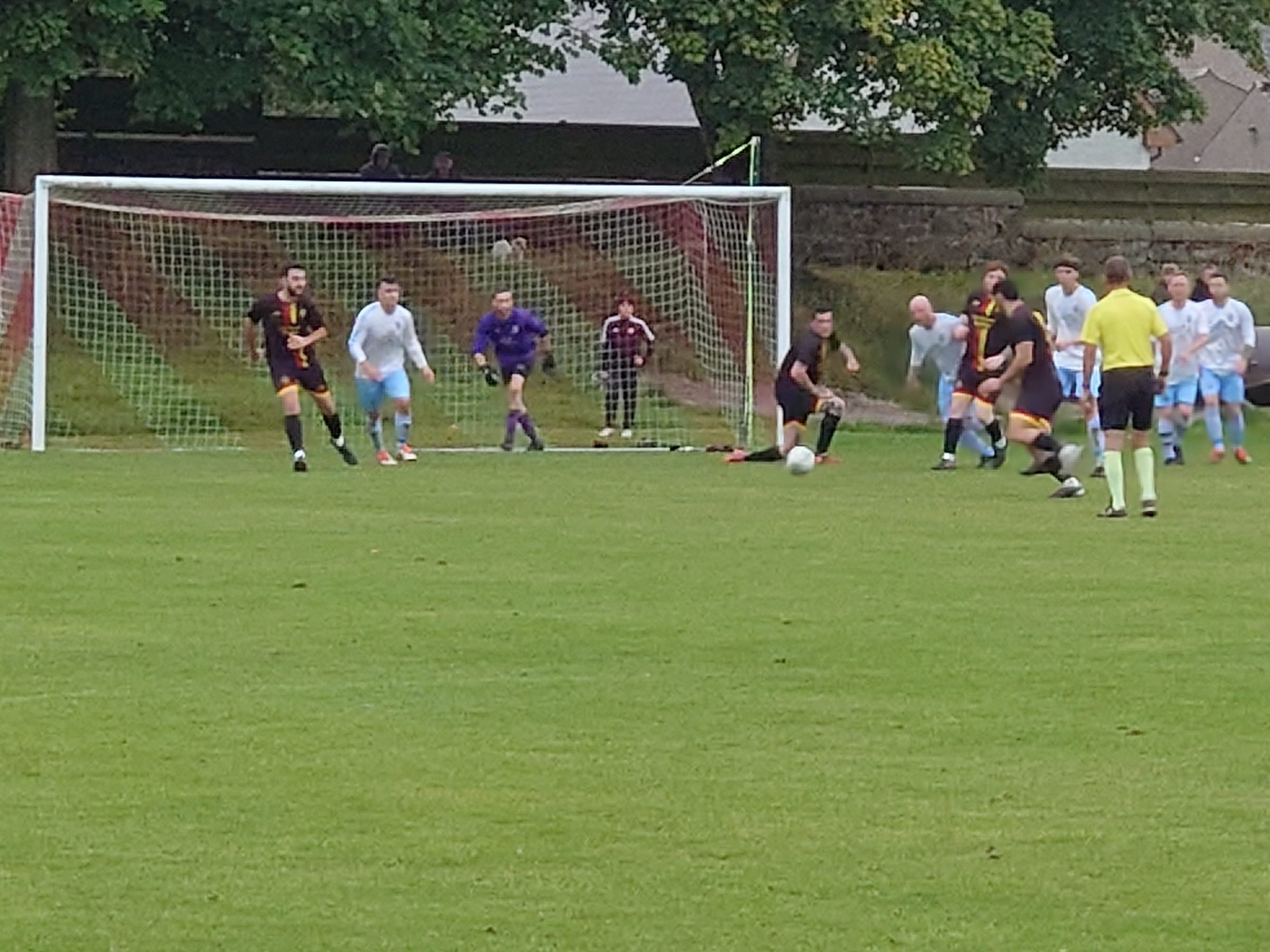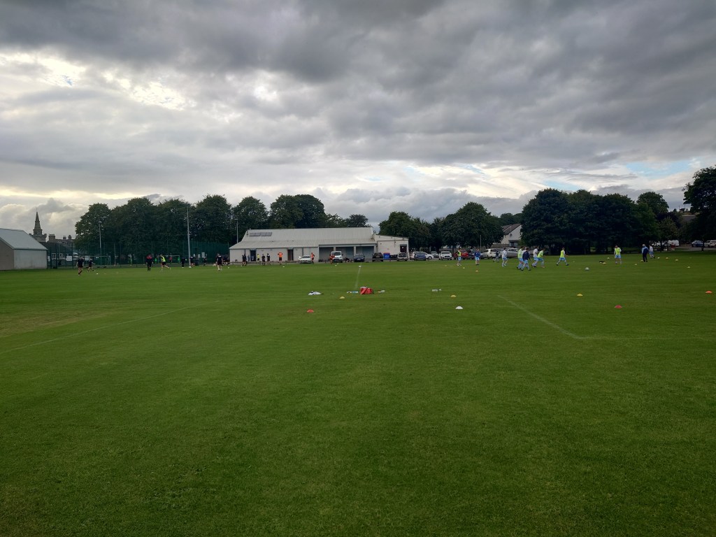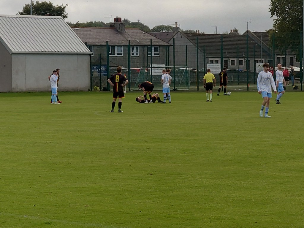 After the half time entertainment of bouncing the ball off one of those …….in fact I don’t even know what they are called, see photos. Anyway, we thought we were in for an early goal when Joel Watt burst through, Thistle keeper Allan was out quick to close the angles, Watt got a toe on it but it went agonisingly wide. Mormond were next up to come close but there really should have been no coming close, they should have been in the lead. Scott hit a shot from range which McLeman saved very well only to see the rebound land at the feet of Liam Allan who incredibly put the ball past the post from a couple of yards. Wee Man had the best view in the house of it as he was on his way back from getting the sweeties out of the car and was behind the goal. He returned to as “did you see that banana?”. The to and fro nature continued and it was Belgar with the next big chance. Lumsden picked the ball up on the half way line and sprinted toward goal (he is fucking rapid for the record), he worked the ball past two defenders but his well struck shot was equally well saved by Allan. This stirred up Belgar who had a decent period of pressure and moments later I cannot help but feel they should have been in the lead. A corner from another Allan save was sent into the box, big defender Fleming got up well above his man but he sent the header wide from three yards. Invercairn were the better team at this point and I had a feeling the goa was coming. But there was a moment that made me change my mind. Belgar broke and seeing Mormond keeper well out of position (too far to one side) Watt cracked an effort that was top corner bound but miraculously Allan somehow despite being out of position earlier scrambled across his line and threw himself to claw the ball out of the postage stamp and to safety, this made me think it was not to be the visitors night. That wasn’t the last chance for Invercairn either as Dylan Price fired a shot wide. It could not have been far away as it hit the net support pole behind the goal. Allan was beaten too. Mormond were cursing Fleming when his opposite number Daniel Smith had an empty goal to smash home into, this he attempted but from out of nowhere the defender flew in with a leg to block the effort and sent the ball over the bar. Truly, fantastic defending. The nil nil conversation between us two started as we were running out of minutes in the game. At this point the rain started and we moved behind the goal under the trees behind the Belgar goal for the last five minutes. A masterstroke it turned out to be as we saw the late late show from Mormond from close up, this inclusive of me catching a cracking photo of the first going in. This was when Charlie Scott smashed a ball across goal from the right into the far top corner. It was an exceptional strike and McLeman could just watch it fly past him. Surely that was game over and to be honest a strike of that quality was worthy of winning a game, but there was more to come when a couple of minutes later Davidson shot and saw the strike take a nick on the way taking it just out of reach of McLeman and that was that and Mormond headed to the summit of the league after what can only be described and another great advert for this under appreciated league. As the final whistle sounded the rain got heavier as we got to the car. But the time we had reached the New Pitsligo/ Peterhead junction a couple of miles out of Strichen it was biblically hammering. It was lucky the game started with an early kick off. One things for sure, there will be no pigeon guts on the motor after the 22 mile car wash it got on the way home