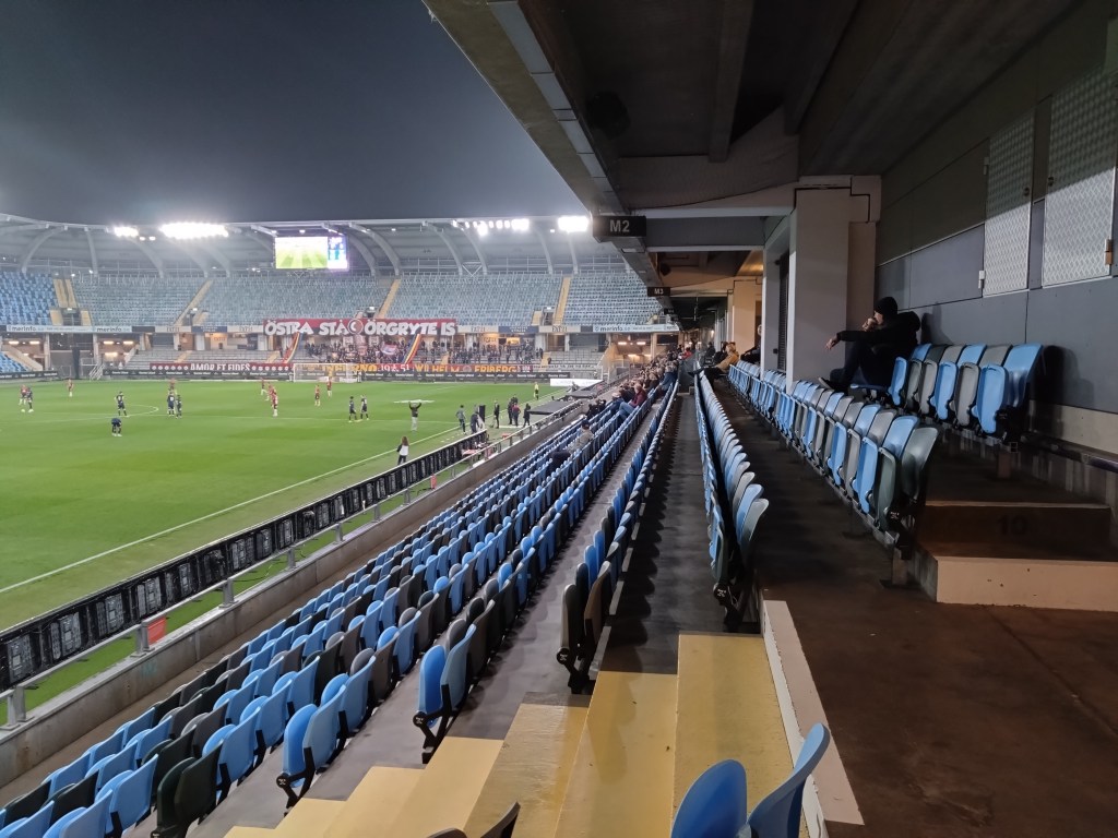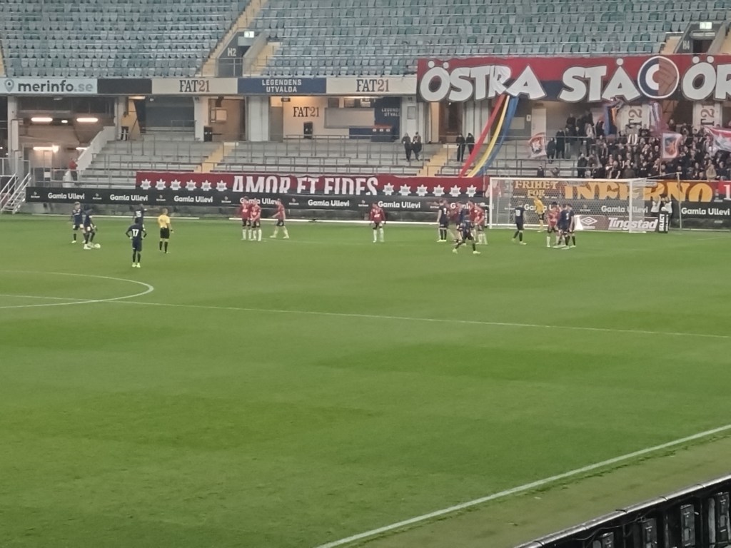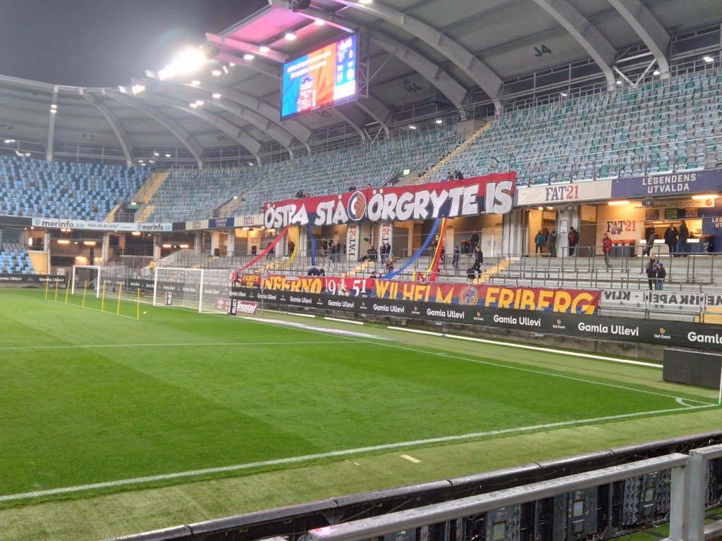 But I digress massively, this is about Sweden’s “Scottish team” and the first game of four across four tiers. I am usually neutral in these scenarios but tonight given the Scottish links I wanted a home win. Second tier Swedish fitba is not something I know much of so I came in not knowing what to expect. One thing that I didn’t expect was the lack of numbers inside the stadium. OIS are a famous old club but the place was empty when we turned up in during the warm up.We almost had the whole wing stand to ourselves with Wee Man choosing the furthest extremity to sit, which t be fair was a good view. It also gave us a good view of the OIS ultras who were great throughout. Armed with the usual drum you would expect at the fitba, but also a snare giving funky beats to some of their songs. I can safely say I had not come across this in my travels before. The ground although empty seemed like it could be a cauldron of noise when full as the Ultras noise was loud and seemed to be trapped. It also gives off the impression of being a lot bigger than the round about 16000 capacity. We will find out what a full house is like on Monday night. On the pitch the first half possession count must have been stacked in Sandvikens favour. They seemed to always be on the ball. Thius aided by constant unforced errors from the home side. But the visitors could not make it count. To be fair to both sides though and it was noticed by Wee man too, the football they both tried to play was good and all played on the deck. I cant think of any instace where the ball was punted in the first half. The first chance was for Sandvikens when defender Smajlovic cut in from the right to smash an effort off the crossbar, it deserved a goal as the power and bend he put on the hit was incredible. Despite the lack of possession OIS took the lead in very similar circumstances as the Smajlovic effort when Isak Dahlqvist cut in from the right and smacked an effort at goal but he managed to get it just under the bar and into the top corner. A stunning hit on the quarter hour. The running of the game did not really change after the goal and again OIS scored against the run of play again with a truly superb team goal which started in their own half. After a multi pass move Noah Christofferson was off on his bike up the wing where he beat his opponents sending a pass to Tobias Sana who layed in perfect ball back to Christofferson who had bust a gut and cutting in and couldn’t miss from inside the box. The away team couldn’t believe what was happening after dominating the ball for such large parts of the game. It looked like a robbery was unfolding.