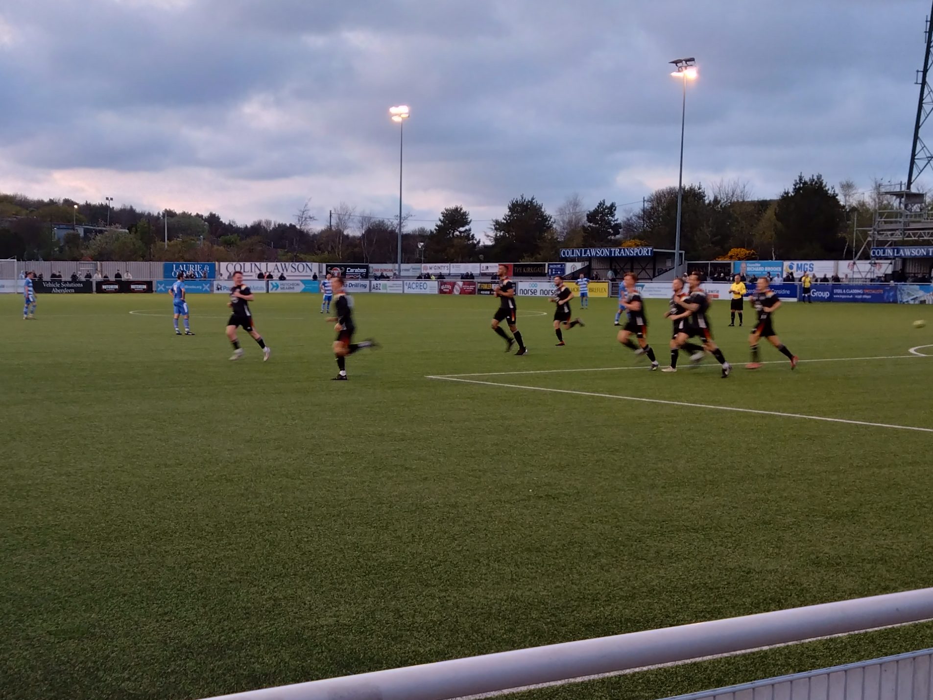 A tight game with both teams having spells of superiority during it. Kincorth started the better of the two. The local side was quicker out the traps. I say local because Wee Man asked where Kincorth was and when thinking about it I couldn’t help but think Cove Rangers ground is actually closer to Kincorth than it is to Cove. (Correct me if I am wrong). The Aberdeen side took the lead through an error in the Cowie box when a ball somehow made it to the back post where it dropped leaving black clad men queuing up to score. It was Ryan Hall on hand who stuck the ball into the net from close range with the nearest man in blue at least five yards away. But if it wasn’t Hall a team mate in the vicinity would have finished the job as Cowie had switched off here. The same man was a ball hair away from making it two a couple of minutes later and it really deserved to go in when Hall managed to angle his body into a strange shape to connect a half volley which had incredible bend and dip on it only to head past the right of the goal frame at the apex of the bar and post. For our view at the other end we saw the elastic nature of Hall’s body and the bend of the ball perfectly. Wee Man thought it was in, I thought it was in and KC sub Michael Gunn who was warming up next to us thought it was in. It deserved to be in. Kincorth had another huge chance when a through ball saw Kieran Wilson burst into the box , Cowie keeper Stuart Miller came out but the Kincorth striker made his way round him and fired at goal, but from what seemed like out of nowhere Cowie’s man mountain of a centre half Martin Crisp went flying across the goal to superbly block the effort. Brilliant defending from the big man. Cowie did ask a question of Jarvie late in the half when McDonald lashed a shot low but the keeper replied with a tidy low save to his left to keep his team in the lead at half time. There was some action off the pitch too. The far enclosure from us was housing the the Cowie young team to start but the Kincorth young boys were not having it and entered the fray. This making the wee terrace seem like a bag of angry ferrets. The angrier of the futrets being the KC boys who pretty much chased the Stonehaveners (correct term?) away reminiscent of old school end taking back in the 70s and 80s. Amusing stuff which carried on for the rest of the game.