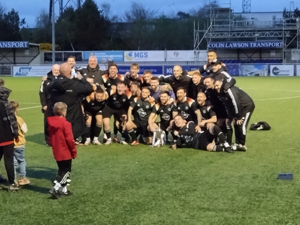 As the young loons continues to stalk and chase each other around the place Kincorth had the ball in the net again. But it was chopped off by the lino in front of us, Mr Gerraghty, for offside. Credit to the assistant for seeing this as he also had to contend with a concurrently raging skirmish on the deck in front of him between the two number 10s , McCombie(C) and McAllister(K) which looked like Judo and not fitba. From here Cowie grew into the game and were the better of the two for a long period of the half, but during what was their best spell of the match they didn’t really make ex Dundee United and Peterhead keeper Paul Jarvie work at any point. This was to cost them as Kincorth sucker punched them when a long through ball found sub Gunn who sprinted to the edge of the box and sent a cool finish past Miller. It was far too easy, leaving Kincorth with one hand on the trophy, while Cowie as holders were losing their grip on it. Cowie resorted to sticking Crisp up top against fellow giant centre half Ifi(very good player for the record) as a last throw of the dice. A tactic I appreciate as does my old mucker and ex KC player Lee Carver who was now in our company. Its a tactic that gets slated in the modern game but is good if utilized correctly. However, for Cowie it didn’t pay off as the game fizzled out. On the opposing central defenders Crisp and Ifi, surely they are the two biggest in the AAFA. I’m a big loon but they both would tower over me. As the darkness started to drop in, the final whistle sounded and Kincorth won the North of Scotland Cup for the fifth time and third in four years. The entertainment was not over for the night as the trophy presentations were quality with the WWF type master of ceremonies yelling and barking out his script. Funny stuff then it was all over for the night as the floodlights were turned off as soon as the KC team photo was taken. As the winning players walked of one shouted “to the Covies”, I am sure it will be some night in the Kincorth boozer tonight.