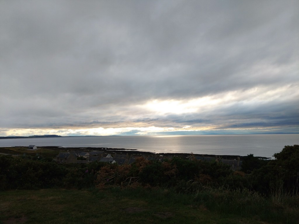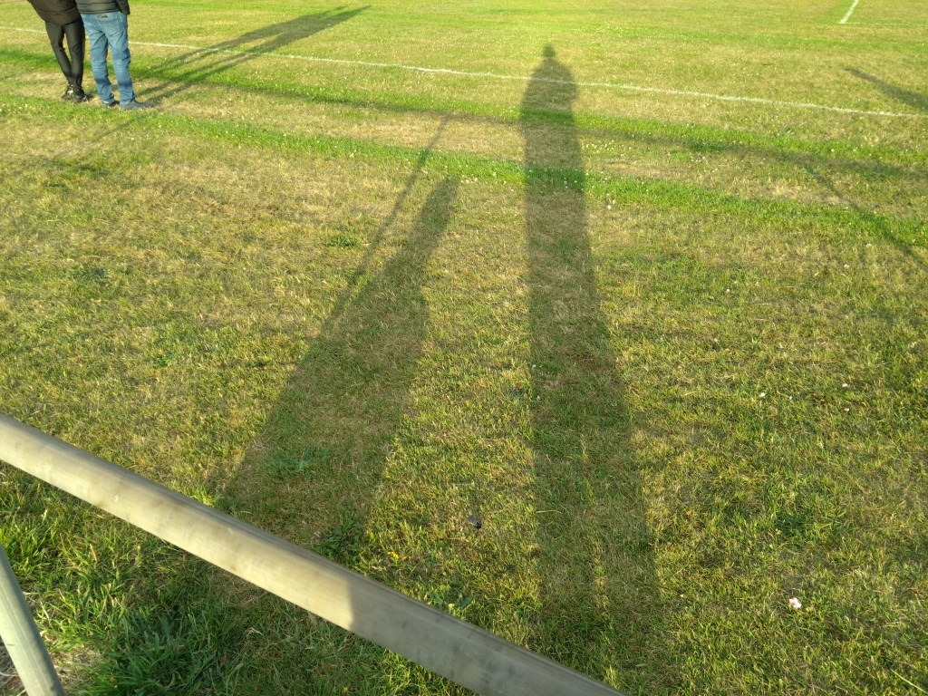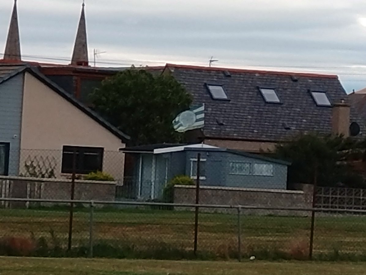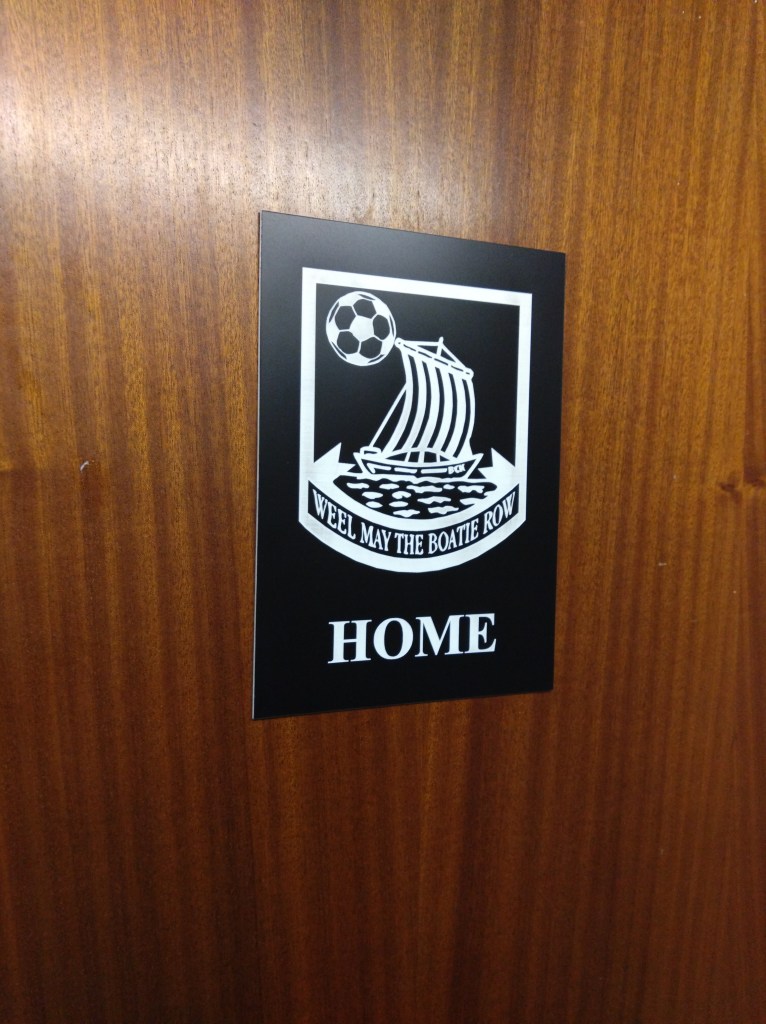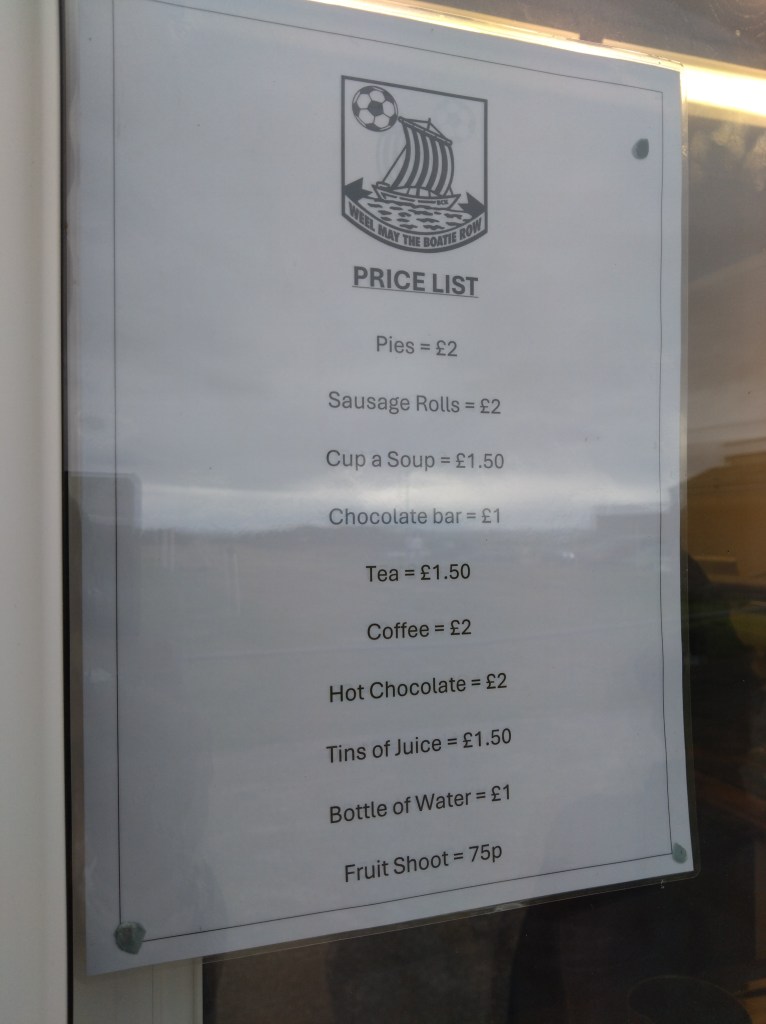 Turning up early to ensure another Merson Park kick about possible allowed us to meet vice chairman Francie who stopped us for a yap as we entered. This gave the clubs vice chairman a chance to work out if we were who he was looking for. Turns out this was so he could gift Wee man a club tourie. A extremely fine gesture from the club that stemmed from speaking to club secretary and player Ross Fiske over Twitter prior to the game to see if he could sort out the team lines for me. A greatly appreciated piece of friendliness and a good start to the visit. The kick about was a strange one. There is lashings of grass to play on adjacent the pitch. But it’s not all grass, it’s made up of what I am assuming is gorse and grass. Jabby and made underfoot feel like a natural astro and made your arse hurt if you sat on it, as Wee Man was to find out. There was also a moment of panic when I sent the ball out the ground towards the lower level of Buckpool after it caught in the wind and went over the perimeter fence. The panic set in when I realised I didn’t know what was on the other side of the thick gorse surrounding Merson Park, was the ball now on its way down towards the “Old Bicycles by the Sea”. Luckily there is path between the park and the drop. There is also bonnie views of the Moray Firth where on a clear night like tonight you can see for miles. But more importantly the yellow ba’ lived another day.