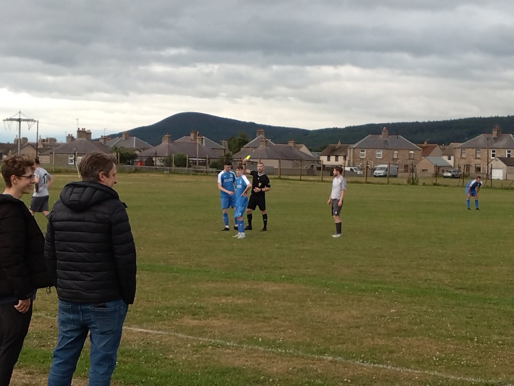 A kick about on the gorse was had again during the break which seemed a long pause for this level of fitba. This suiting Wee Man. Buckie were better in the second half and really should have had a third early on. This after a Cafu-esque run up the right from fullback McMillan, he laid the ball on a plate for numerous team mates in the box but it wasn’t to be and the ball was wasted resulting in a goal kick. The run deserved a goal and McMillan’s family (mum, dad, sister, fine folk) next to us were aggrieved the ball was not in the net. Ross Fiske went close for Rovers when he ran in behind. With a defender catching he sent him the wrong way switching the ball to his left, but the powerful effort was well saved by Christie. The Craigellachie keeper was soon back in action again when Buckie forward Jordan Mackie pulled a tidy save out of the purple clad keeper up to his right. The resulting corner was sent deep into the box where the head of centre half Kris Murray cushioned the ball down to Mackie where this time the Buckie number 11 made no mistake. 3 v 0 and an extremely high chance the points were staying at Merson Park. A time ticked on it looked like I was getting the score correct which would see my name engraved on the shield** for the first time as we will have two more games left this season and I would be in a three game lead. However, step up Harry Kendrick who got in behind the Buckie defence to lift the ball over Fraser who had rushed toward him to narrow the angle. A tidy finish but a pain for me personally. But chances are I will still get my maiden bragging rights come the end of next week. A point of note today which I was impressed with, Buckie had a 16 year old in their starting line up in Lucas McPherson and finished with a further two of the same age come full time. Great to see and if Rovers have aspirations of returning to the Juniors….or North of Scotland League as it is now known, getting young loons a couple of seasons at Welfare level against men may come in handy. On the aspirations of the club, it looks to be run like a Junior club as an outsider looking in. A club also full of friendly folk, Francie, Ross(who came over when he was subbed for a face to face), the folk in the pie shack, the McMillans. I wish them all the best with their plans I hope it all goes well. “Weel May the Boatie Row” as the motto of the club says and very “weel” it has rowed so far since the Rovers return.