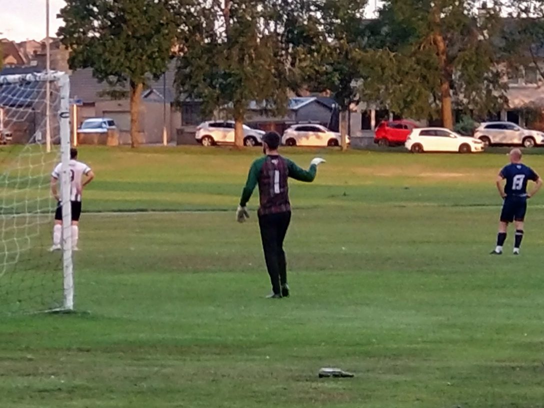 An unusual kick about for us as Wee Man created a game where he would go flying into 50/50s with me. Basically he would try and hit the ball as hard as he could against me planting my foot. Daft but funny none the less despite the numerous stains that would require a suppy Vanish appearing as he was sent to the turf many times. The Vikings started the second half as they finished the first, with the ball in the net. It was far too easy for the home side and it was also a hat trick for Lees when he was played in behind on the right clean through and he made no mistake from 8 yards. Fair play to the Sappers who weren’t giving up and reduced the arrears when Cattel grabbed his brace after taking advantage of a misjudgement from Johnson. The Viking were getting forward a lot and this was proven by the amount of times Wee Man went to retrieve the ball for Wilson-Marr. But that also told the story of the chances spurned. Off the top of my head I think they only hit the target in the second half once after the goal when Gault headed a corner with venom which Wilson-Marr did well to tip over. As the game was running out of time Kinloss were more on the attack and with the last kick of the ball Richmond struck at goal pulling a very tidy save out of Johnson who was up quick to recover the second ball. He may have been guilty for Sappers goals but this save kept the points at the Docoot as no sooner had the big keeper released the ball the final whistle sounded ending a very enjoyable night. Seven goals, a hat-trick and an inhabited docoot. What more do you need in a game?